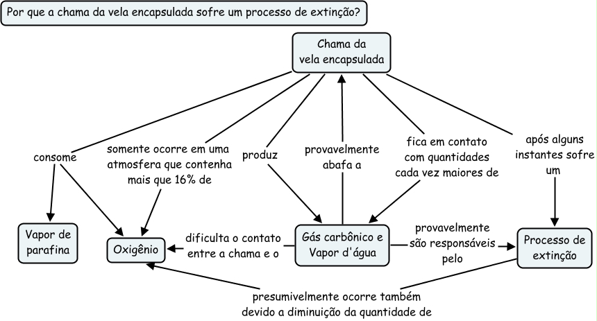 This Concept Map, created with IHMC CmapTools, has information related to: Chama da vela 3, Chama da vela encapsulada consome Vapor de parafina, Chama da vela encapsulada consome Oxigênio, Chama da vela encapsulada somente ocorre em uma atmosfera que contenha mais que 16% de Oxigênio, Gás carbônico e Vapor d'água dificulta o contato entre a chama e o Oxigênio, Gás carbônico e Vapor d'água provavelmente abafa a Chama da vela encapsulada, Chama da vela encapsulada após alguns instantes sofre um Processo de extinção, Chama da vela encapsulada produz Gás carbônico e Vapor d'água, Gás carbônico e Vapor d'água provavelmente são responsáveis pelo Processo de extinção, Chama da vela encapsulada fica em contato com quantidades cada vez maiores de Gás carbônico e Vapor d'água, Processo de extinção presumivelmente ocorre também devido a diminuição da quantidade de Oxigênio