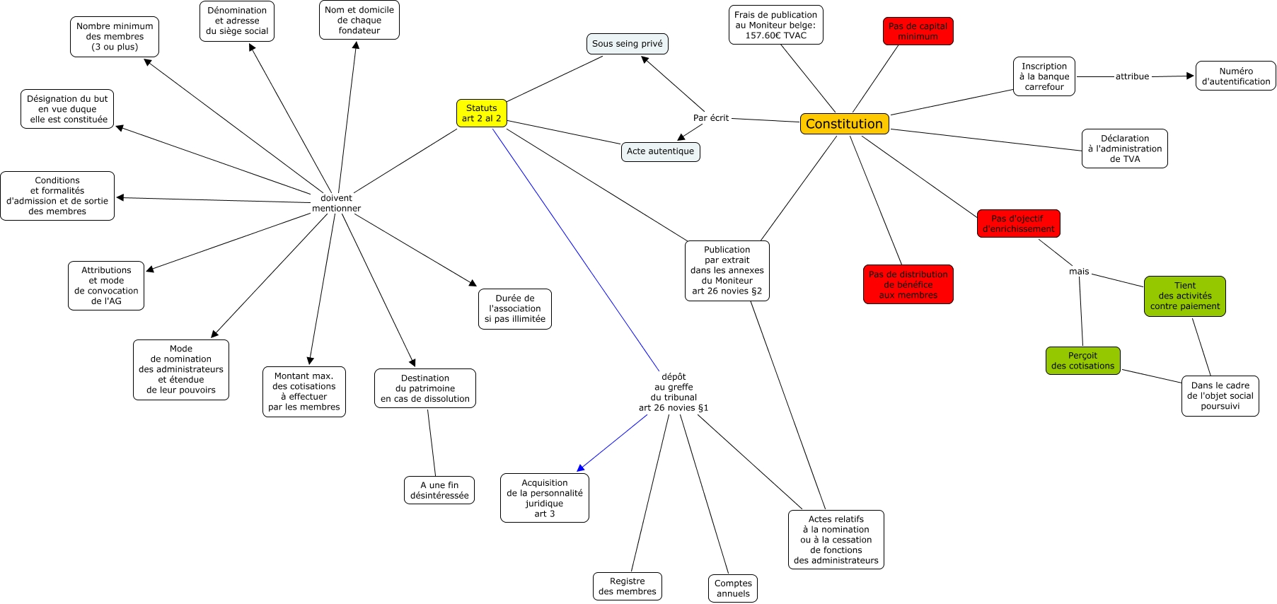 Cette carte de concepts créée avec IHMC CmapTools traite de: ASBL Page 3, Inscription à la banque carrefour attribue Numéro d'autentification, Acte autentique ???? Statuts art 2 al 2, Statuts art 2 al 2 doivent mentionner Nom et domicile de chaque fondateur, Actes relatifs à la nomination ou à la cessation de fonctions des administrateurs dépôt au greffe du tribunal art 26 novies §1 Acquisition de la personnalité juridique art 3, Statuts art 2 al 2 doivent mentionner Désignation du but en vue duque elle est constituée, Tient des activités contre paiement ???? Dans le cadre de l'objet social poursuivi, Constitution Par écrit Sous seing privé, Statuts art 2 al 2 doivent mentionner Conditions et formalités d'admission et de sortie des membres, Constitution ???? Pas de capital minimum, Constitution ???? Publication par extrait dans les annexes du Moniteur art 26 novies §2, Statuts art 2 al 2 doivent mentionner Montant max. des cotisations à effectuer par les membres, Perçoit des cotisations ???? Dans le cadre de l'objet social poursuivi, Statuts art 2 al 2 doivent mentionner Attributions et mode de convocation de l'AG, Constitution ???? Pas d'ojectif d'enrichissement, Actes relatifs à la nomination ou à la cessation de fonctions des administrateurs ???? Publication par extrait dans les annexes du Moniteur art 26 novies §2, Publication par extrait dans les annexes du Moniteur art 26 novies §2 ???? Statuts art 2 al 2, Registre des membres dépôt au greffe du tribunal art 26 novies §1 Acquisition de la personnalité juridique art 3, Constitution ???? Déclaration à l'administration de TVA, Statuts art 2 al 2 doivent mentionner Destination du patrimoine en cas de dissolution, Constitution ???? Pas de distribution de bénéfice aux membres