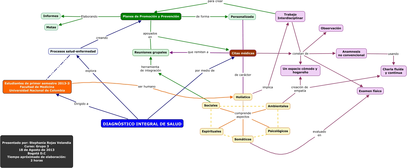 Este Cmap, tiene información relacionada con: Rojas S mapa ensayo inicial G3, Trabajo Interdisciplinar constan de Anamnesis no convencional, Citas médicas que remiten a Reuniones grupales, Trabajo Interdisciplinar constan de Observación, Estudiantes de primer semestre 2013-3 Facultad de Medicina Universidad Nacional de Colombia ser humano Holístico, Holístico comprende aspectos Sociales, Trabajo Interdisciplinar constan de Examen físico, Planes de Promoción y Prevención apoyados en Citas médicas, Trabajo Interdisciplinar constan de Un espacio cómodo y hogareño, DIAGNÓSTICO INTEGRAL DE SALUD Dirigido a Estudiantes de primer semestre 2013-3 Facultad de Medicina Universidad Nacional de Colombia, Holístico comprende aspectos Espirituales, Ambientales creación de empatía Un espacio cómodo y hogareño, Personalizada ???? Citas médicas, Ambientales creación de empatía Charla fluída y continua, Citas médicas constan de Anamnesis no convencional, Planes de Promoción y Prevención apoyados en Reuniones grupales, Sociales ???? Espirituales, Procesos salud-enfermedad ???? Estudiantes de primer semestre 2013-3 Facultad de Medicina Universidad Nacional de Colombia, Holístico comprende aspectos Psicológicos, Planes de Promoción y Prevención Elaborando Informes, Holístico comprende aspectos Ambientales