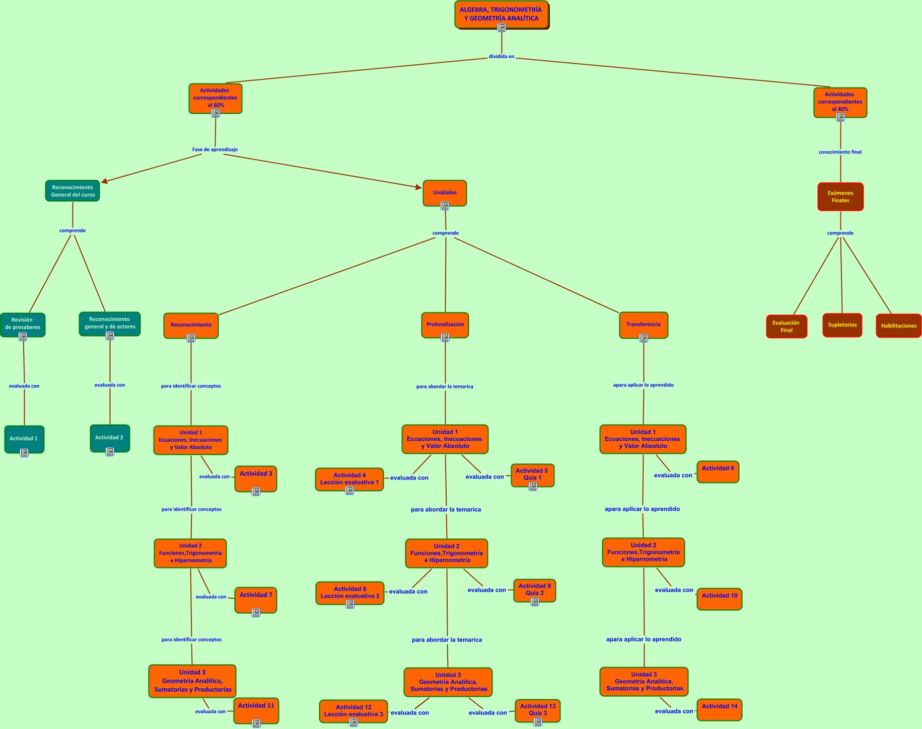 Este Cmap, tiene información relacionada con: Mapa conceptual 2, ALGEBRA, TRIGONOMETRÍA Y GEOMETRÍA ANALÍTICA dividida en Actividades correspondientes al 60%, Exámenes Finales comprende Evaluación Final, Unidad 1 Ecuaciones, Inecuaciones y Valor Absoluto evaluada con Actividad 5 Quiz 1, Unidad 1 Ecuaciones, Inecuaciones y Valor Absoluto apara aplicar lo aprendido Unidad 2 Funciones,Trigonometría e Hipernometría, Unidades comprende Profundización, Unidades comprende Reconocimiento, Unidad 2 Funciones,Trigonometría e Hipernometría apara aplicar lo aprendido Unidad 3 Geometría Analítica, Sumatorias y Productorias, Unidad 1 Ecuaciones, Inecuaciones y Valor Absoluto evaluada con Actividad 4 Lección evaluativa 1, Unidad 3 Geometría Analítica, Sumatorias y Productorias evaluada con Actividad 11, Exámenes Finales comprende Habilitaciones, Unidad 2 Funciones,Trigonometría e Hipernometría evaluada con Actividad 9 Quiz 2, Unidad 3 Geometría Analítica, Sumatorias y Productorias evaluada con Actividad 14, Actividades correspondientes al 60% Fase de aprendizaje Reconocimiento General del curso, Actividades correspondientes al 40% conocimiento final Exámenes Finales, Revisión de presaberes evaluada con Actividad 1, Unidad 2 Funciones,Trigonometría e Hipernometría evaluada con Actividad 10, ALGEBRA, TRIGONOMETRÍA Y GEOMETRÍA ANALÍTICA dividida en Actividades correspondientes al 40%, Unidad 2 Funciones,Trigonometría e Hipernometría evaluada con Actividad 8 Lección evaluativa 2, Unidad 1 Ecuaciones, Inecuaciones y Valor Absoluto para abordar la temarica Unidad 2 Funciones,Trigonometría e Hipernometría, Unidades comprende Transferencia
