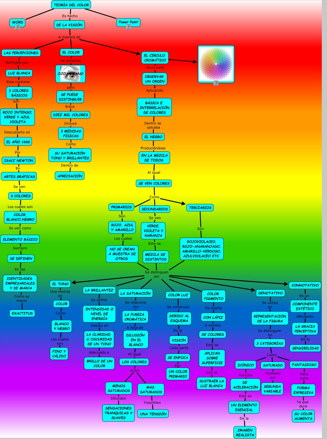 Este Cmap, tiene información relacionada con: el color, EN LA MEZCLA DE TODOS Al igual SE VEN COLORES, BÁSICA E INTERRELACIÓN DE COLORES Dentro se ubicaba EL NEGRO, LOS COLORES Entre MAS SATURADOS, COLOR LUZ Se construye DEBIDO AL ESQUEMA, SE ENFOCA Por UN COLOR PRIMARIO, 3 CATEGORÍAS Como FANTASIOSO, ELEMENTO BÁSICO Siempre SE DEFINEN, MEZCLA DE DISTINTOS Se distinguen por LA SATURACIÓN, EL AÑO 1666 Por ISACC NEWTON, TEORÍA DEL COLOR ???? WORD, DE LA VISIÓN A manera de EL COLOR, LOS COLORES Entre MENOS SATURADOS, TEORÍA DEL COLOR ???? Power Paint, APLICAN SOBRE SUPERFICIE Con el SUSTRAER LA LUZ BLANCA, ROJOVIOLACEO, ROJO-ANARANJADO, AMARILLO-VERDOSO, AZULVIOLACEO ETC. Se distinguen por COLOR LUZ, NO SE CREAN A MUESTRA DE OTROS Se distinguen por COLOR PIGMENTO, SE VEN COLORES Como SECUNDARIOS, TEORÍA DEL COLOR Es hecho DE LA VISIÓN, NO SE CREAN A MUESTRA DE OTROS Se distinguen por DENOTATIVO, MEZCLA DE DISTINTOS Se distinguen por CONNOTATIVO