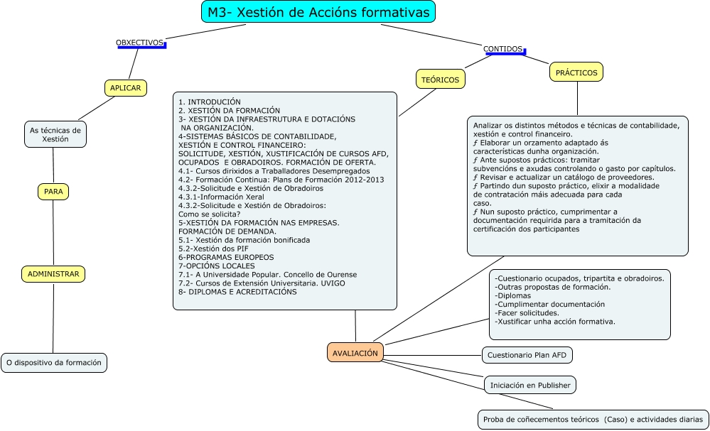 Este Cmap, tiene información relacionada con: M3, Analizar os distintos métodos e técnicas de contabilidade, xestión e control financeiro. ƒ Elaborar un orzamento adaptado ás características dunha organización. ƒ Ante supostos prácticos: tramitar subvencións e axudas controlando o gasto por capítulos. ƒ Revisar e actualizar un catálogo de proveedores. ƒ Partindo dun suposto práctico, elixir a modalidade de contratación máis adecuada para cada caso. ƒ Nun suposto práctico, cumprimentar a documentación requirida para a tramitación da certificación dos participantes ???? AVALIACIÓN, As técnicas de Xestión ???? PARA, M3- Xestión de Accións formativas CONTIDOS PRÁCTICOS, AVALIACIÓN ???? Iniciación en Publisher, AVALIACIÓN ???? -Cuestionario ocupados, tripartita e obradoiros. -Outras propostas de formación. -Diplomas -Cumplimentar documentación -Facer solicitudes. -Xustificar unha acción formativa., ADMINISTRAR ???? O dispositivo da formación, APLICAR ???? As técnicas de Xestión, PARA ???? ADMINISTRAR, TEÓRICOS 1. INTRODUCIÓN 2. XESTIÓN DA FORMACIÓN 3- XESTIÓN DA INFRAESTRUTURA E DOTACIÓNS NA ORGANIZACIÓN. 4-SISTEMAS BÁSICOS DE CONTABILIDADE, XESTIÓN E CONTROL FINANCEIRO: SOLICITUDE, XESTIÓN, XUSTIFICACIÓN DE CURSOS AFD, OCUPADOS E OBRADOIROS. FORMACIÓN DE OFERTA. 4.1- Cursos dirixidos a Traballadores Desempregados 4.2- Formación Continua: Plans de Formación 2012-2013 4.3.2-Solicitude e Xestión de Obradoiros 4.3.1-Información Xeral 4.3.2-Solicitude e Xestión de Obradoiros: Como se solicita? 5-XESTIÓN DA FORMACIÓN NAS EMPRESAS. FORMACIÓN DE DEMANDA. 5.1- Xestión da formación bonificada 5.2-Xestión dos PIF 6-PROGRAMAS EUROPEOS 7-OPCIÓNS LOCALES 7.1- A Universidade Popular. Concello de Ourense 7.2- Cursos de Extensión Universitaria. UVIGO 8- DIPLOMAS E ACREDITACIÓNS, AVALIACIÓN ???? Proba de coñecementos teóricos (Caso) e actividades diarias, AVALIACIÓN ???? Cuestionario Plan AFD, 1. INTRODUCIÓN 2. XESTIÓN DA FORMACIÓN 3- XESTIÓN DA INFRAESTRUTURA E DOTACIÓNS NA ORGANIZACIÓN. 4-SISTEMAS BÁSICOS DE CONTABILIDADE, XESTIÓN E CONTROL FINANCEIRO: SOLICITUDE, XESTIÓN, XUSTIFICACIÓN DE CURSOS AFD, OCUPADOS E OBRADOIROS. FORMACIÓN DE OFERTA. 4.1- Cursos dirixidos a Traballadores Desempregados 4.2- Formación Continua: Plans de Formación 2012-2013 4.3.2-Solicitude e Xestión de Obradoiros 4.3.1-Información Xeral 4.3.2-Solicitude e Xestión de Obradoiros: Como se solicita? 5-XESTIÓN DA FORMACIÓN NAS EMPRESAS. FORMACIÓN DE DEMANDA. 5.1- Xestión da formación bonificada 5.2-Xestión dos PIF 6-PROGRAMAS EUROPEOS 7-OPCIÓNS LOCALES 7.1- A Universidade Popular. Concello de Ourense 7.2- Cursos de Extensión Universitaria. UVIGO 8- DIPLOMAS E ACREDITACIÓNS ???? AVALIACIÓN, M3- Xestión de Accións formativas OBXECTIVOS APLICAR, M3- Xestión de Accións formativas CONTIDOS TEÓRICOS, PRÁCTICOS Analizar os distintos métodos e técnicas de contabilidade, xestión e control financeiro. ƒ Elaborar un orzamento adaptado ás características dunha organización. ƒ Ante supostos prácticos: tramitar subvencións e axudas controlando o gasto por capítulos. ƒ Revisar e actualizar un catálogo de proveedores. ƒ Partindo dun suposto práctico, elixir a modalidade de contratación máis adecuada para cada caso. ƒ Nun suposto práctico, cumprimentar a documentación requirida para a tramitación da certificación dos participantes