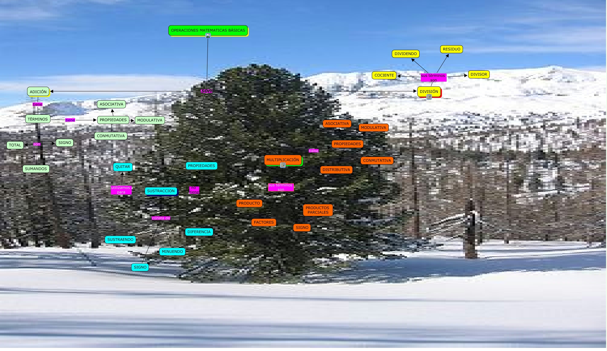 Este Cmap, tiene información relacionada con: OPERACIONES MATEMATICAS, DIVISIÓN sus términos son DIVIDENDO, SUSTRACCION consta de DIFERENCIA, TËRMINOS son TOTAL, DIVISIÓN sus términos son DIVISOR, OPERACIONES MATEMATICAS BÁSICAS son ADICIÓN, SUSTRACCION consta de SUSTRAENDO, TËRMINOS son SIGNO, PROPIEDADES ???? ASOCIATIVA, SUSTRACCION consta de SIGNO, MULTIPLICACIÓN tiene PROPIEDADES, PROPIEDADES ???? DISTRIBUTIVA, MULTIPLICACIÓN sus terminos son SIGNO, TËRMINOS tiene PROPIEDADES, PROPIEDADES ???? CONMUTATIVA, PROPIEDADES ???? ASOCIATIVA, PROPIEDADES ???? CONMUTATIVA, OPERACIONES MATEMATICAS BÁSICAS son MULTIPLICACIÓN, MULTIPLICACIÓN sus terminos son FACTORES, SUSTRACCION utilizamos para QUITAR, OPERACIONES MATEMATICAS BÁSICAS son SUSTRACCION
