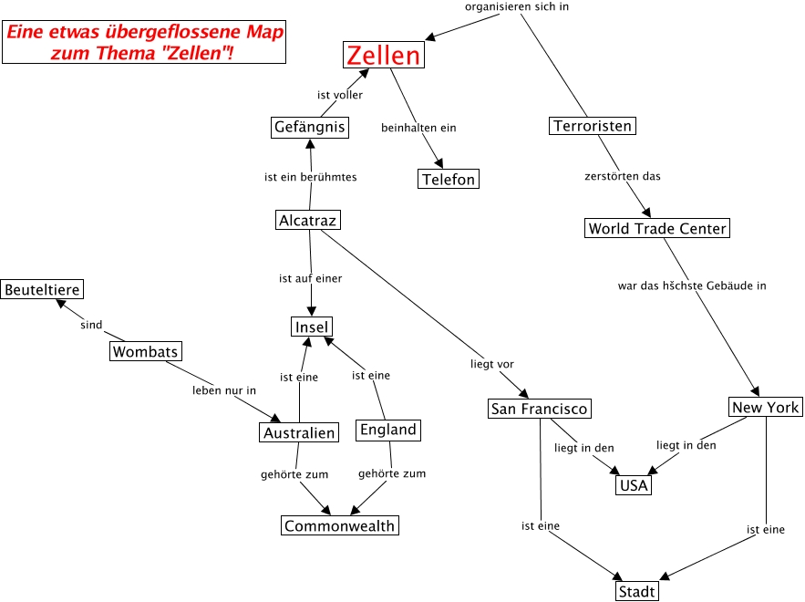 Dieses mit IHMC CmapTools erstellte CMap hat Informationen bezüglich: Zelle 0, Alcatraz liegt vor San Francisco, Australien ist eine Insel, San Francisco ist eine Stadt, Australien gehörte zum Commonwealth, England gehörte zum Commonwealth, Gefängnis ist voller Zellen, New York ist eine Stadt, England ist eine Insel, Alcatraz ist ein berühmtes Gefängnis, New York liegt in den USA, Alcatraz ist auf einer Insel, Wombats sind Beuteltiere, Terroristen zerstörten das World Trade Center, Terroristen organisieren sich in Zellen, Zellen beinhalten ein Telefon, San Francisco liegt in den USA, Wombats leben nur in Australien, World Trade Center war das hšchste Gebäude in New York