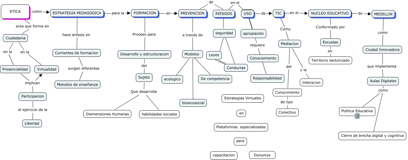Este Cmap, tiene información relacionada con: categorizacion_del_problema_de_investigacion.cmap, Conductas ???? Leyes, ESTRATEGIA PEDAGOGICA para la FORMACION, TIC Como Mediacion, Leyes ???? Conductas, PREVENCION a través de Modelos, Modelos ???? biosicosocial, Aulas Digitales como Politica Educativa, ETICA como ESTRATEGIA PEDAGOGICA, Sujeto Que desarrolla habilidades sociales, USO requiere Responsabilidad, Modelos De competencia, Mediacion del Conocimiento, MEDELLIN como Ciudad Innovadora, Desarrollo y estructuracion del Sujeto, NUCLEO EDUCATIVO Conformado por Escuelas, Corrientes de formacion surgen diferentes Metodos de enseñanza, NUCLEO EDUCATIVO de MEDELLIN, RIESGOS ???? Conductas, Presencialidad implican Participacion, ETICA area que forma en Ciudadania
