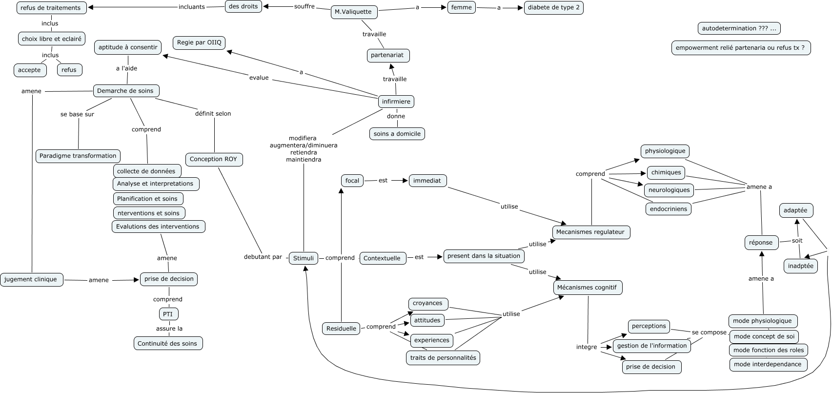Cette carte de concepts créée avec IHMC CmapTools traite de: Sic 2 perso-josee, femme a diabete de type 2, adaptée inadptée, Stimuli comprend Residuelle, Mécanismes cognitif integre perceptions, endocriniens amene a réponse, Demarche de soins se base sur Paradigme transformation, Mecanismes regulateur comprend neurologiques, present dans la situation utilise Mecanismes regulateur, prise de decision comprend PTI, Demarche de soins définit selon Conception ROY, experiences utilise Mécanismes cognitif, prise de decision se compose mode concept de soi, Residuelle comprend experiences, Mécanismes cognitif integre gestion de l'information, réponse soit adaptée, mode physiologique amene a réponse, infirmiere donne soins a domicile, infirmiere travaille partenariat, réponse soit inadptée, mode interdependance ???? mode fonction des roles