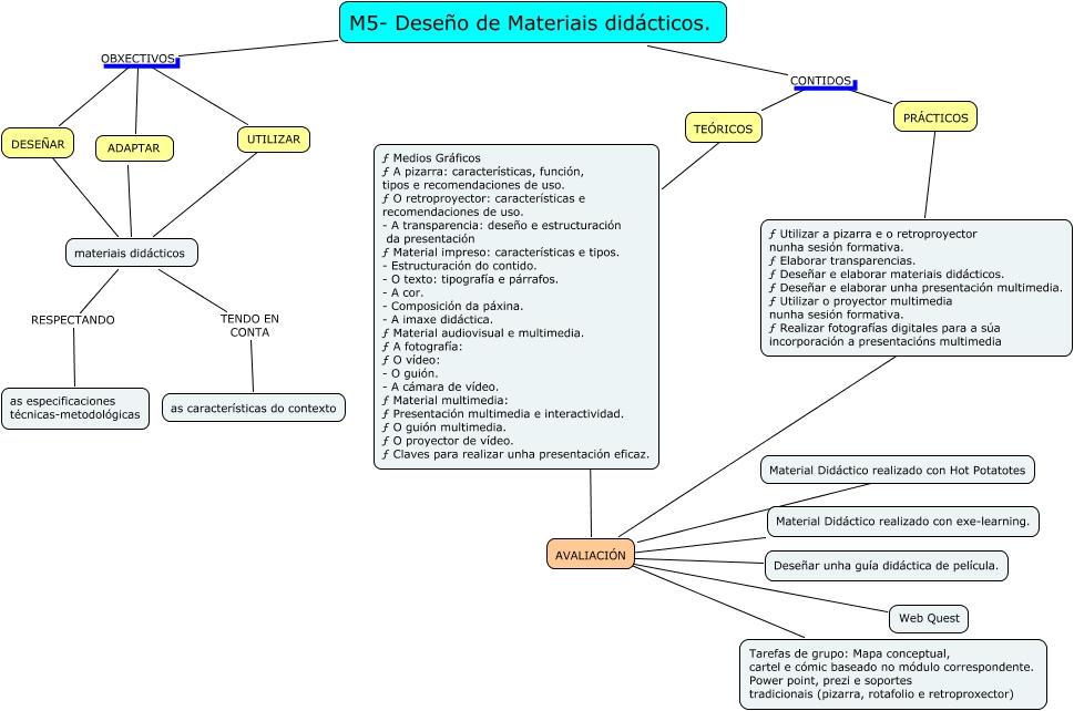 Este Cmap, tiene información relacionada con: M5, AVALIACIÓN ???? Material Didáctico realizado con exe-learning., PRÁCTICOS ƒ Utilizar a pizarra e o retroproyector nunha sesión formativa. ƒ Elaborar transparencias. ƒ Deseñar e elaborar materiais didácticos. ƒ Deseñar e elaborar unha presentación multimedia. ƒ Utilizar o proyector multimedia nunha sesión formativa. ƒ Realizar fotografías digitales para a súa incorporación a presentacións multimedia, AVALIACIÓN ???? Material Didáctico realizado con Hot Potatotes, M5- Deseño de Materiais didácticos. CONTIDOS PRÁCTICOS, AVALIACIÓN ???? Deseñar unha guía didáctica de película., M5- Deseño de Materiais didácticos. OBXECTIVOS ADAPTAR, DESEÑAR ???? materiais didácticos, M5- Deseño de Materiais didácticos. OBXECTIVOS UTILIZAR, AVALIACIÓN ???? Web Quest, M5- Deseño de Materiais didácticos. OBXECTIVOS DESEÑAR, UTILIZAR ???? materiais didácticos, AVALIACIÓN ???? Tarefas de grupo: Mapa conceptual, cartel e cómic baseado no módulo correspondente. Power point, prezi e soportes tradicionais (pizarra, rotafolio e retroproxector), M5- Deseño de Materiais didácticos. CONTIDOS TEÓRICOS, ƒ Medios Gráficos ƒ A pizarra: características, función, tipos e recomendaciones de uso. ƒ O retroproyector: características e recomendaciones de uso. - A transparencia: deseño e estructuración da presentación ƒ Material impreso: características e tipos. - Estructuración do contido. - O texto: tipografía e párrafos. - A cor. - Composición da páxina. - A imaxe didáctica. ƒ Material audiovisual e multimedia. ƒ A fotografía: ƒ O vídeo: - O guión. - A cámara de vídeo. ƒ Material multimedia: ƒ Presentación multimedia e interactividad. ƒ O guión multimedia. ƒ O proyector de vídeo. ƒ Claves para realizar unha presentación eficaz. ???? AVALIACIÓN, materiais didácticos RESPECTANDO as especificaciones técnicas-metodológicas, materiais didácticos TENDO EN CONTA as características do contexto, TEÓRICOS ƒ Medios Gráficos ƒ A pizarra: características, función, tipos e recomendaciones de uso. ƒ O retroproyector: características e recomendaciones de uso. - A transparencia: deseño e estructuración da presentación ƒ Material impreso: características e tipos. - Estructuración do contido. - O texto: tipografía e párrafos. - A cor. - Composición da páxina. - A imaxe didáctica. ƒ Material audiovisual e multimedia. ƒ A fotografía: ƒ O vídeo: - O guión. - A cámara de vídeo. ƒ Material multimedia: ƒ Presentación multimedia e interactividad. ƒ O guión multimedia. ƒ O proyector de vídeo. ƒ Claves para realizar unha presentación eficaz., ƒ Utilizar a pizarra e o retroproyector nunha sesión formativa. ƒ Elaborar transparencias. ƒ Deseñar e elaborar materiais didácticos. ƒ Deseñar e elaborar unha presentación multimedia. ƒ Utilizar o proyector multimedia nunha sesión formativa. ƒ Realizar fotografías digitales para a súa incorporación a presentacións multimedia ???? AVALIACIÓN, ADAPTAR materiais didácticos