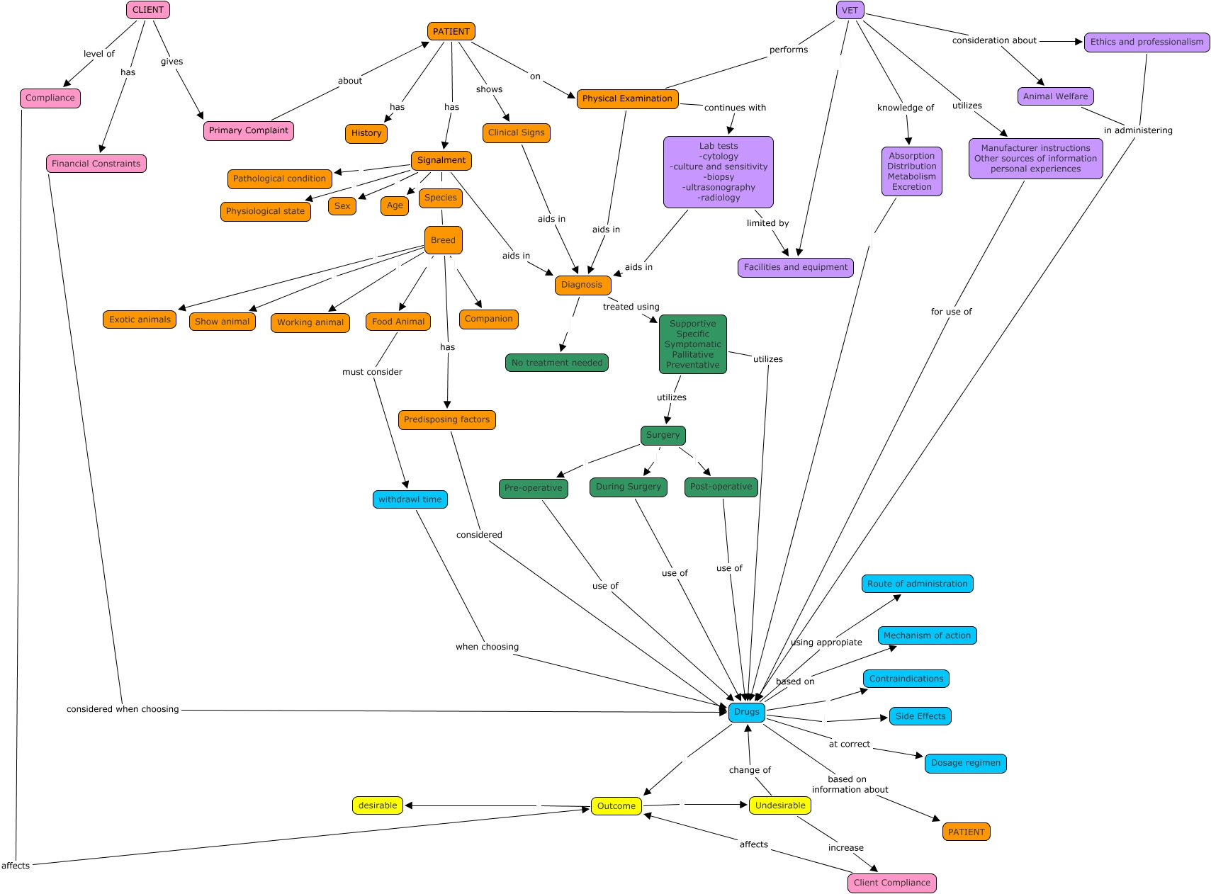 This Concept Map, created with IHMC CmapTools, has information related to: Drug usage in clin setting GpB, Post-operative use of Drugs, CLIENT level of Compliance, Food Animal must consider withdrawl time, Outcome Undesirable, Lab tests -cytology -culture and sensitivity -biopsy -ultrasonography -radiology aids in Diagnosis, Drugs Outcome, Signalment Age, Signalment Sex, VET knowledge of Absorption Distribution Metabolism Excretion, Signalment Species, VET utilizes Manufacturer instructions Other sources of information personal experiences, Supportive Specific Symptomatic Pallitative Preventative utilizes Surgery, Breed Exotic animals, Animal Welfare in administering Drugs, Surgery Pre-operative, Physical Examination aids in Diagnosis, VET performs Physical Examination, Drugs based on information about PATIENT, Client Compliance affects Outcome, Lab tests -cytology -culture and sensitivity -biopsy -ultrasonography -radiology limited by Facilities and equipment