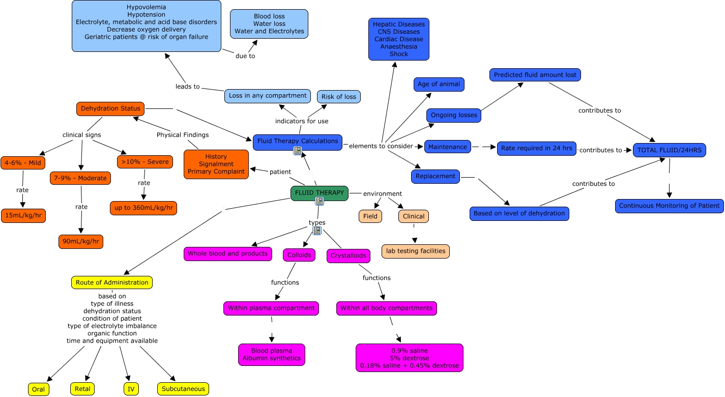 This Concept Map, created with IHMC CmapTools, has information related to: Fluid therapy, FLUID THERAPY types Whole blood and products, Route of Administration based on type of illness dehydration status condition of patient type of electrolyte imbalance organic function time and equipment available IV, Within plasma compartment Blood plasma Albumin synthetics, Loss in any compartment leads to Hypovolemia Hypotension Electrolyte, metabolic and acid base disorders Decrease oxygen delivery Geriatric patients @ risk of organ failure, Crystalloids functions Within all body compartments, Colloids functions Within plasma compartment, FLUID THERAPY types Crystalloids, Maintenance Rate required in 24 hrs, FLUID THERAPY environment Clinical, TOTAL FLUID/24HRS Continuous Monitoring of Patient, FLUID THERAPY types Colloids, FLUID THERAPY Route of Administration, FLUID THERAPY patient History Signalment Primary Complaint, Fluid Therapy Calculations indicators for use Risk of loss, History Signalment Primary Complaint Physical Findings Dehydration Status, Fluid Therapy Calculations indicators for use Loss in any compartment, Replacement Based on level of dehydration, Based on level of dehydration contributes to TOTAL FLUID/24HRS, Fluid Therapy Calculations elements to consider Replacement, FLUID THERAPY environment Field