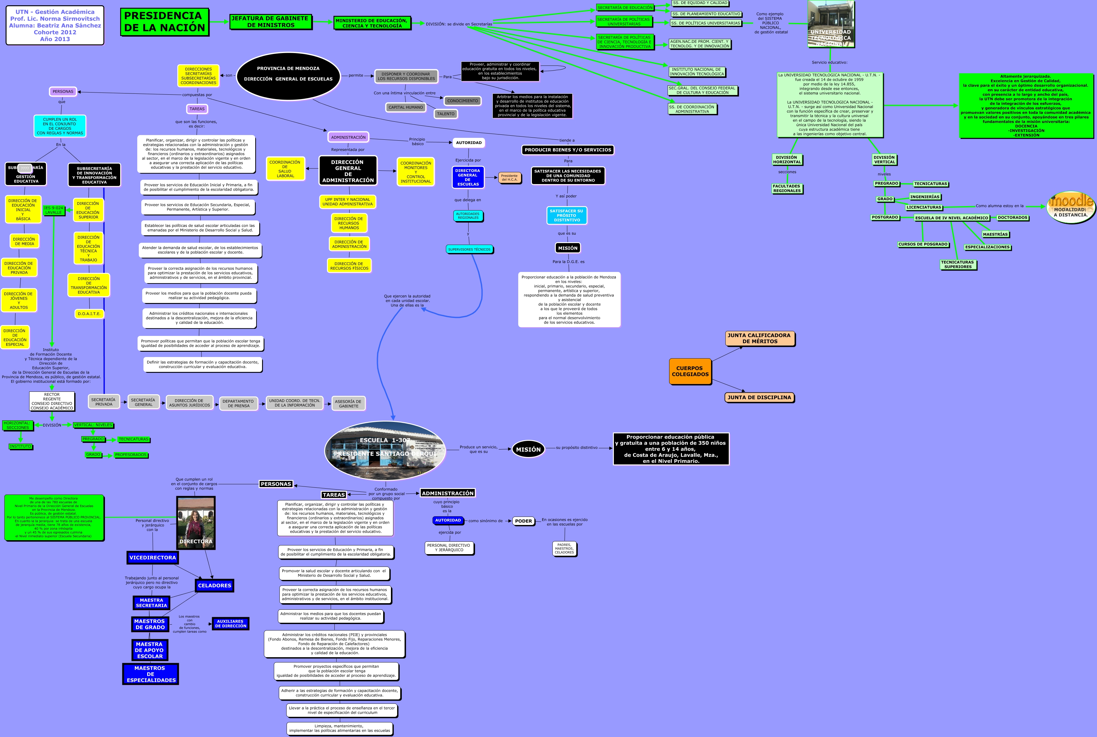 Este Cmap, tiene información relacionada con: Organización educativa en el sistema educativo nacional, PERSONAS Que cumplen un rol en el conjunto de cargos con reglas y normas DIRECTORA, DIRECTORA GENERAL DE ESCUELAS que delega en AUTORIDADES REGIONALES, DIRECCIÓN DE EDUCACIÓN SUPERIOR ???? IES 9-024 LAVALLE, ESCUELA 1-307 PRESIDENTE SANTIAGO DERQUI Conformado por un grupo social compuesto por TAREAS, SUPERVISORES TÉCNICOS Que ejercen la autoridad en cada unidad escolar. Una de ellas es la ESCUELA 1-307 PRESIDENTE SANTIAGO DERQUI, PREGRADO ???? GRADO, TAREAS ???? Planificar, organizar, dirigir y controlar las políticas y estrategias relacionadas con la administración y gestión de: los recursos humanos, materiales, tecnológicos y financieros (ordinarios y extraordinarios) asignados al sector, en el marco de la legislación vigente y en orden a asegurar una correcta aplicación de las políticas educativas y la prestación del servicio educativo., ESCUELA DE IV NIVEL ACADÉMICO ???? TECNICATURAS SUPERIORES, PERSONAS que CUMPLEN UN ROL EN EL CONJUNTO DE CARGOS CON REGLAS Y NORMAS, Promover políticas que permitan que la población escolar tenga igualdad de posibilidades de acceder al proceso de aprendizaje. ???? Definir las estrategias de formación y capacitación docente, construcción curricular y evaluación educativa., Proveer la correcta asignación de los recursos humanos para optimizar la prestación de los servicios educativos, administrativos y de servicios, en el ámbito institucional. ???? Administrar los medios para que los docentes puedan realizar su actividad pedagógica., AUTORIDAD Ejercicida por DIRECTORA GENERAL DE ESCUELAS, LICENCIATURAS Como alumna estoy en la MODALIDAD: A DISTANCIA., Promover proyectos específicos que permitan que la población escolar tenga igualdad de posibilidades de acceder al proceso de aprendizaje. ???? Adherir a las estrategias de formación y capacitación docente, construcción curricular y evaluación educativa., DIRECCIÓN DE EDUCACIÓN INICIAL Y BÁSICA ???? DIRECCIÓN DE MEDIA, MINISTERIO DE EDUCACIÓN, CIENCIA Y TECNOLOGÍA DIVISIÓN: se divide en Secretarías SECRETARÍA DE POLÍTICAS UNIVERSITARIAS, La UNIVERSIDAD TECNOLOGICA NACIONAL - U.T.N. - fue creada el 14 de octubre de 1959 por medio de la ley 14.855, integrando desde ese entonces, el sistema universitario nacional. La UNIVERSIDAD TECNOLOGICA NACIONAL - U.T.N. - surge así como Universidad Nacional con la función específica de crear, preservar y transmitir la técnica y la cultura universal en el campo de la tecnología, siendo la única Universidad Nacional del país cuya estructura académica tiene a las ingenierías como objetivo central. ???? DIVISIÓN HORIZONTAL, Proveer los servicios de Educación Inicial y Primaria, a fin de posibilitar el cumplimiento de la escolaridad obligatoria. ???? Proveer los servicios de Educación Secundaria, Especial, Permanente, Artística y Superior., PROVINCIA DE MENDOZA DIRECCIÓN GENERAL DE ESCUELAS tiende a PRODUCIR BIENES Y/O SERVICIOS, DISPONER Y COORDINAR LOS RECURSOS DISPONIBLES Con una íntima vinculación entre CONOCIMIENTO