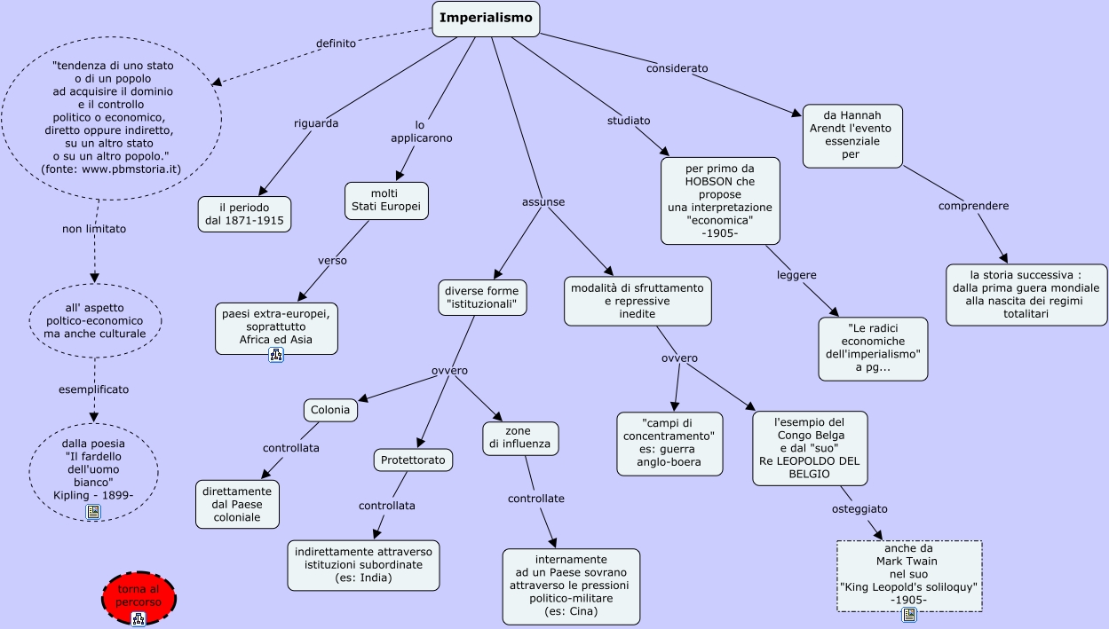 Questa Cmap, creata con IHMC CmapTools, contiene informazioni relative a: imperialismo, Imperialismo lo applicarono molti Stati Europei, per primo da HOBSON che propose una interpretazione "economica" -1905- leggere "Le radici economiche dell'imperialismo" a pg..., Imperialismo assunse modalità di sfruttamento e repressive inedite, Colonia controllata direttamente dal Paese coloniale, molti Stati Europei verso paesi extra-europei, soprattutto Africa ed Asia, Imperialismo assunse diverse forme "istituzionali", diverse forme "istituzionali" ovvero Protettorato, zone di influenza controllate internamente ad un Paese sovrano attraverso le pressioni politico-militare (es: Cina), diverse forme "istituzionali" ovvero Colonia, Imperialismo considerato da Hannah Arendt l'evento essenziale per, diverse forme "istituzionali" ovvero zone di influenza, Imperialismo riguarda il periodo dal 1871-1915, Imperialismo studiato per primo da HOBSON che propose una interpretazione "economica" -1905-, da Hannah Arendt l'evento essenziale per comprendere la storia successiva : dalla prima guera mondiale alla nascita dei regimi totalitari, modalità di sfruttamento e repressive inedite ovvero "campi di concentramento" es: guerra anglo-boera, modalità di sfruttamento e repressive inedite ovvero l'esempio del Congo Belga e dal "suo" Re LEOPOLDO DEL BELGIO, l'esempio del Congo Belga e dal "suo" Re LEOPOLDO DEL BELGIO osteggiato anche da Mark Twain nel suo "King Leopold's soliloquy" -1905-, Imperialismo definito "tendenza di uno stato o di un popolo ad acquisire il dominio e il controllo politico o economico, diretto oppure indiretto, su un altro stato o su un altro popolo." (fonte: www.pbmstoria.it), all' aspetto poltico-economico ma anche culturale esemplificato dalla poesia "Il fardello dell'uomo bianco" Kipling - 1899-, "tendenza di uno stato o di un popolo ad acquisire il dominio e il controllo politico o economico, diretto oppure indiretto, su un altro stato o su un altro popolo." (fonte: www.pbmstoria.it) non limitato all' aspetto poltico-economico ma anche culturale