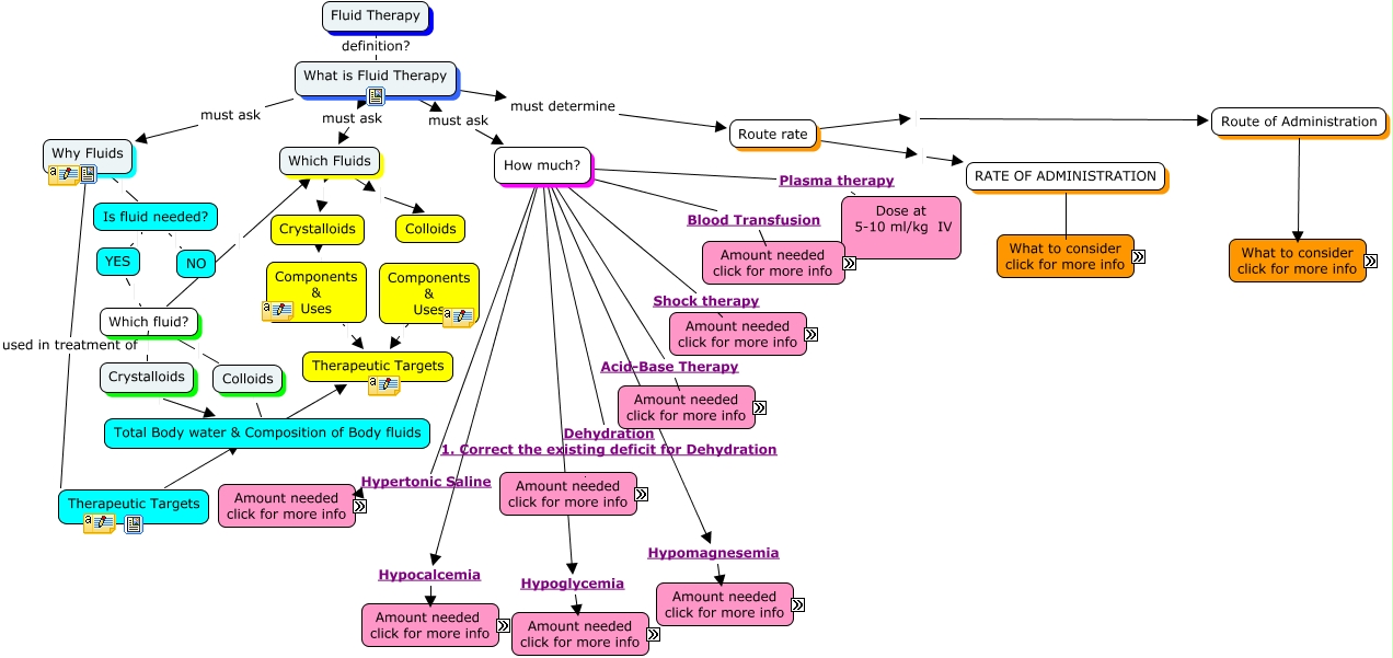 This Concept Map, created with IHMC CmapTools, has information related to: Clinical Pharmacology Fluid Therapy, Which Fluids Colloids, Fluid therapy for non cardiogenic SHOCK Simply adding 0 to body weight in pounds results in a conservative shock bolus, y grams/13= z Liters ???? Replace ½ of this volume over 1-2 hours and re-evaluate, How much? Hypertonic Saline 4-5ml/kg at a rate of 1ml/kg/min, Which Fluids Crystalloids, 1 gram Baking soda = 12 mEQ Bicarb ans for (1)/ 12 = y grams (to correct acidosis) Isotonic Sodium Bicarbonate is 1.3%, What is Fluid Therapy must determine Route rate, maintenance requirement for a dairy cow is 60 g of glucose/h 500-mL bottle of 50% dextrose (contains 250 g dextrose) every 4 to 6 hours (OVER 10 MINUTES), Replacements are calculated based on the level of dehydration 50ml/kg/24hr, or 2ml/kg/hr. encorperated to determine Replacements are calculated based on the level of dehydration Replacement = % Dehydration x Bodyweight (kg) x 10?, Is fluid needed? YES, Why Fluids used in treatment of Therapeutic Targets, % dehydration X body weight Kg = Volume to be replaced at 10-20ml/kg/hr (4-8L/hr) 2. Satisfy maintenance needs 50-60 ml/Kg per day at 2-4ml/kg/hr, Simply adding 0 to body weight in pounds results in a conservative shock bolus equating to a 22 mL/kg bolus (eg, 70 lb + 0 = 700 mL), Replacements are calculated based on the level of dehydration 50ml/kg/24hr, or 2ml/kg/hr. encorperated to determine Ongoing losses are calculated based on a predicted fluid amount lost by a patient within a 24 hour period Ongoing losses = Amount per loss (ml/kg) x Bodyweight (kg) x No. of losses, Is fluid needed? NO, IV is slowed until a second arrhythmia is detected Remainder is placed SQ over the lateral thorax, 100 mL of the 25% epsom salt solution slow intravenous administration (for at least 5 minutes), 1) Replacement 2) Maintainance 3) Ongoing losses http://en.wikivet.net/Principles_of_Fluid_Therapy ongoing losses Ongoing losses are calculated based on a predicted fluid amount lost by a patient within a 24 hour period Ongoing losses = Amount per loss (ml/kg) x Bodyweight (kg) x No. of losses, How much? Blood Transfusion Amt of blood req estimated at 2ml/Kg (raises PCV by 1%) and administrated at a rate of 20ml/kg/h., How much? Hypocalcemia Administer 1 mL/kg BW