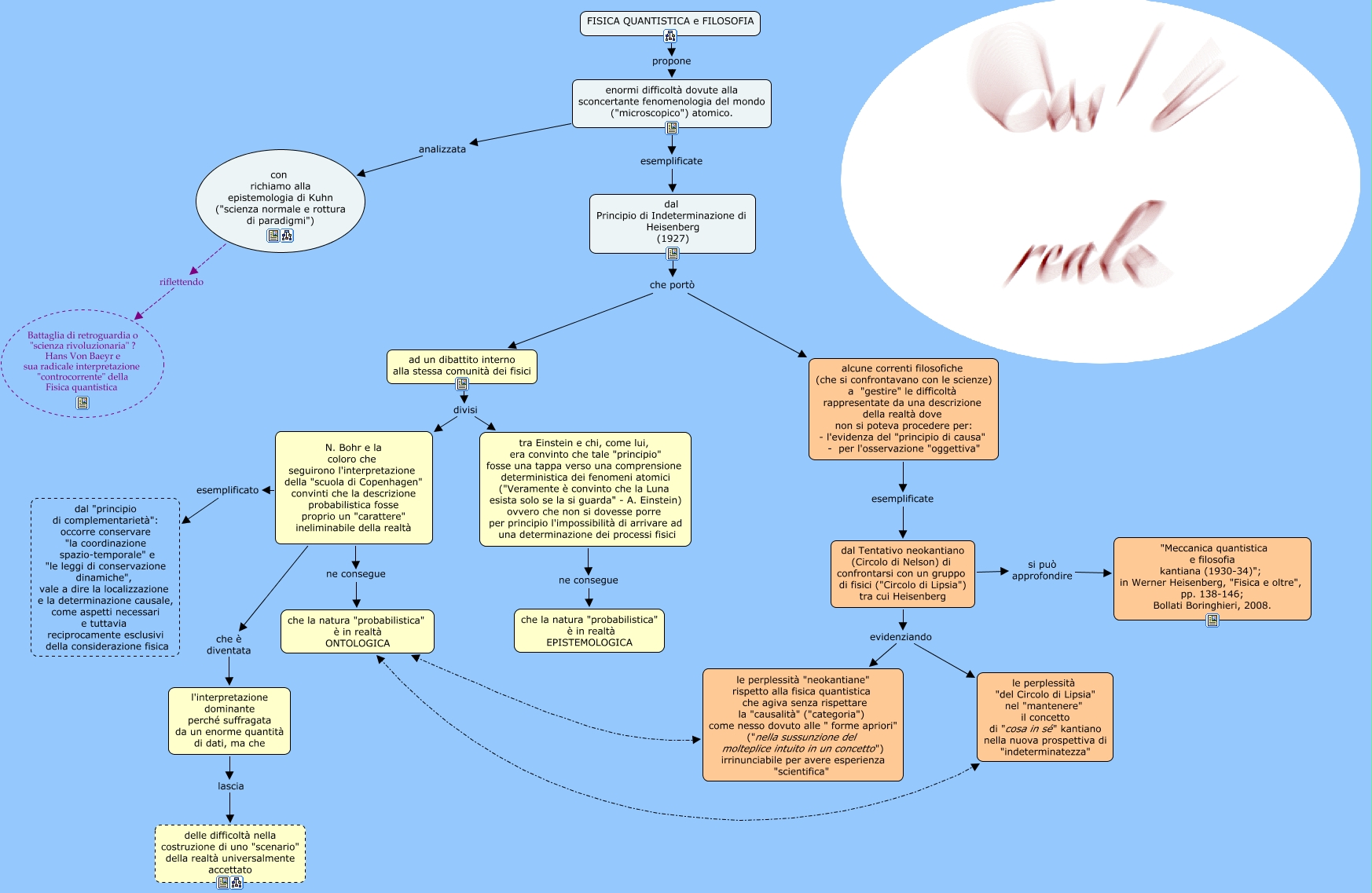 Questa Cmap, creata con IHMC CmapTools, contiene informazioni relative a: fisica quantistica e filosofia, con richiamo alla epistemologia di Kuhn ("scienza normale e rottura di paradigmi") riflettendo Battaglia di retroguardia o "scienza rivoluzionaria" ? Hans Von Baeyr e sua radicale interpretazione "controcorrente" della Fisica quantistica, N. Bohr e la coloro che seguirono l'interpretazione della "scuola di Copenhagen" convinti che la descrizione probabilistica fosse proprio un "carattere" ineliminabile della realtà esemplificato dal "principio di complementarietà": occorre conservare "la coordinazione spazio-temporale" e "le leggi di conservazione dinamiche", vale a dire la localizzazione e la determinazione causale, come aspetti necessari e tuttavia reciprocamente esclusivi della considerazione fisica, N. Bohr e la coloro che seguirono l'interpretazione della "scuola di Copenhagen" convinti che la descrizione probabilistica fosse proprio un "carattere" ineliminabile della realtà che è diventata l'interpretazione dominante perché suffragata da un enorme quantità di dati, ma che, enormi difficoltà dovute alla sconcertante fenomenologia del mondo ("microscopico") atomico. esemplificate dal Principio di Indeterminazione di Heisenberg (1927), che la natura "probabilistica" è in realtà ONTOLOGICA le perplessità "neokantiane" rispetto alla fisica quantistica che agiva senza rispettare la "causalità" ("categoria") come nesso dovuto alle " forme apriori" ("nella sussunzione del molteplice intuito in un concetto") irrinunciabile per avere esperienza "scientifica", tra Einstein e chi, come lui, era convinto che tale "principio" fosse una tappa verso una comprensione deterministica dei fenomeni atomici ("Veramente è convinto che la Luna esista solo se la si guarda" - A. Einstein) ovvero che non si dovesse porre per principio l'impossibilità di arrivare ad una determinazione dei processi fisici ne consegue che la natura "probabilistica" è in realtà EPISTEMOLOGICA, dal Tentativo neokantiano (Circolo di Nelson) di confrontarsi con un gruppo di fisici ("Circolo di Lipsia") tra cui Heisenberg evidenziando le perplessità "neokantiane" rispetto alla fisica quantistica che agiva senza rispettare la "causalità" ("categoria") come nesso dovuto alle " forme apriori" ("nella sussunzione del molteplice intuito in un concetto") irrinunciabile per avere esperienza "scientifica", FISICA QUANTISTICA e FILOSOFIA propone enormi difficoltà dovute alla sconcertante fenomenologia del mondo ("microscopico") atomico., che la natura "probabilistica" è in realtà ONTOLOGICA le perplessità "del Circolo di Lipsia" nel "mantenere" il concetto di "cosa in sé" kantiano nella nuova prospettiva di "indeterminatezza", dal Tentativo neokantiano (Circolo di Nelson) di confrontarsi con un gruppo di fisici ("Circolo di Lipsia") tra cui Heisenberg evidenziando le perplessità "del Circolo di Lipsia" nel "mantenere" il concetto di "cosa in sé" kantiano nella nuova prospettiva di "indeterminatezza", dal Principio di Indeterminazione di Heisenberg (1927) che portò ad un dibattito interno alla stessa comunità dei fisici, enormi difficoltà dovute alla sconcertante fenomenologia del mondo ("microscopico") atomico. analizzata con richiamo alla epistemologia di Kuhn ("scienza normale e rottura di paradigmi"), l'interpretazione dominante perché suffragata da un enorme quantità di dati, ma che lascia delle difficoltà nella costruzione di uno "scenario" della realtà universalmente accettato, alcune correnti filosofiche (che si confrontavano con le scienze) a "gestire" le difficoltà rappresentate da una descrizione della realtà dove non si poteva procedere per: - l'evidenza del "principio di causa" - per l'osservazione "oggettiva" esemplificate dal Tentativo neokantiano (Circolo di Nelson) di confrontarsi con un gruppo di fisici ("Circolo di Lipsia") tra cui Heisenberg, dal Tentativo neokantiano (Circolo di Nelson) di confrontarsi con un gruppo di fisici ("Circolo di Lipsia") tra cui Heisenberg si può approfondire "Meccanica quantistica e filosofia kantiana (1930-34)"; in Werner Heisenberg, "Fisica e oltre", pp. 138-146; Bollati Boringhieri, 2008., ad un dibattito interno alla stessa comunità dei fisici divisi tra Einstein e chi, come lui, era convinto che tale "principio" fosse una tappa verso una comprensione deterministica dei fenomeni atomici ("Veramente è convinto che la Luna esista solo se la si guarda" - A. Einstein) ovvero che non si dovesse porre per principio l'impossibilità di arrivare ad una determinazione dei processi fisici, ad un dibattito interno alla stessa comunità dei fisici divisi N. Bohr e la coloro che seguirono l'interpretazione della "scuola di Copenhagen" convinti che la descrizione probabilistica fosse proprio un "carattere" ineliminabile della realtà, dal Principio di Indeterminazione di Heisenberg (1927) che portò alcune correnti filosofiche (che si confrontavano con le scienze) a "gestire" le difficoltà rappresentate da una descrizione della realtà dove non si poteva procedere per: - l'evidenza del "principio di causa" - per l'osservazione "oggettiva", N. Bohr e la coloro che seguirono l'interpretazione della "scuola di Copenhagen" convinti che la descrizione probabilistica fosse proprio un "carattere" ineliminabile della realtà ne consegue che la natura "probabilistica" è in realtà ONTOLOGICA
