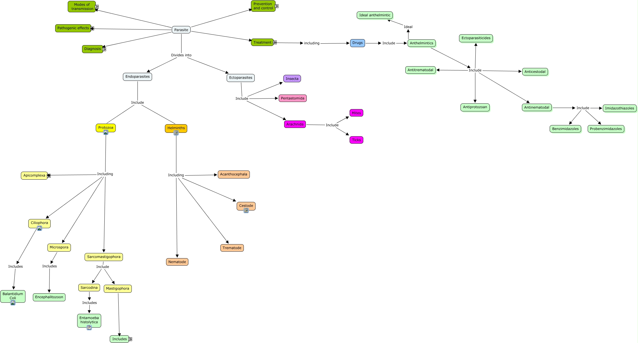 This Concept Map, created with IHMC CmapTools, has information related to: parasites, Apicomplexa Includes Piroplasmidia, Protozoa Including Sarcomastigophora, Protozoa Including Apicomplexa, Sarcodina Includes Entamoeba histolytica, Anthelmintics Include Antiprotozoan, Ectoparasites Include Pentastomida, Parasite Cause harm to their hosts by Absorbing readily digesting food materials meant for the host, Ectoparasites Include Arachnida, Mastigophora Includes Trypanosoma, Apicomplexa Includes Hemosporidia, Hemosporidia Includes Plasmodium, Parasite Cause harm to their hosts by Feeding on the host's body fluids(blod, lymph, exudates), Protozoa Including Ciliophora, Arachnida Include Ticks, Mastigophora Includes Leishmania, Piroplasmidia Includes Babesia, Parasite Treatment Surgical, Parasite Modes of transmission Through Skin, Endoparasites Include Protozoa, Coccidia Includes Neospora