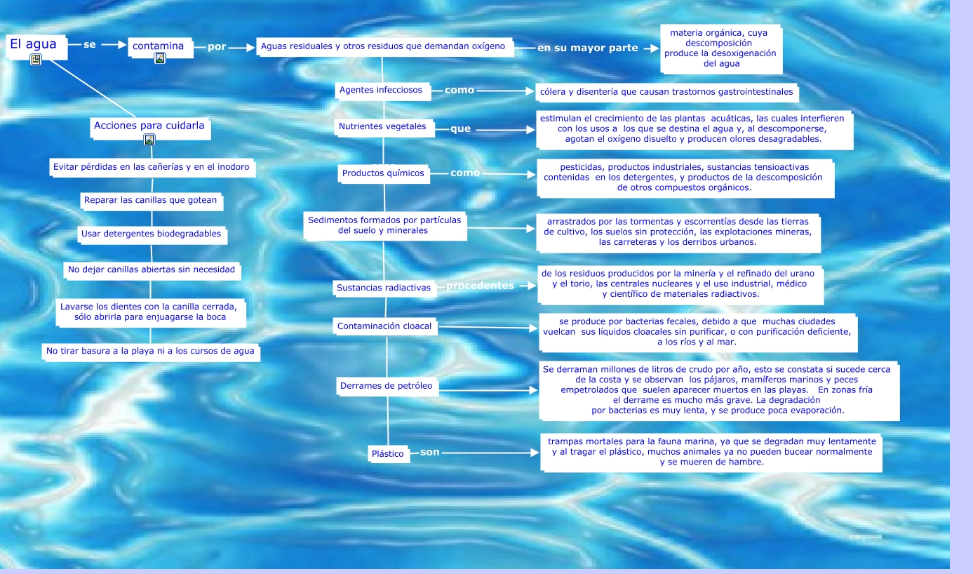 Este Cmap, tiene información relacionada con: Contaminación y cuidado del agua, Contaminación cloacal ???? se produce por bacterias fecales, debido a que muchas ciudades vuelcan sus líquidos cloacales sin purificar, o con purificación deficiente, a los ríos y al mar., Sedimentos formados por partículas del suelo y minerales ???? arrastrados por las tormentas y escorrentías desde las tierras de cultivo, los suelos sin protección, las explotaciones mineras, las carreteras y los derribos urbanos., Agentes infecciosos como cólera y disentería que causan trastornos gastrointestinales, Usar detergentes biodegradables ???? No dejar canillas abiertas sin necesidad, Acciones para cuidarla ???? Evitar pérdidas en las cañerías y en el inodoro, Lavarse los dientes con la canilla cerrada, sólo abrirla para enjuagarse la boca ???? No tirar basura a la playa ni a los cursos de agua, Productos químicos ???? Sedimentos formados por partículas del suelo y minerales, Reparar las canillas que gotean ???? Usar detergentes biodegradables, Aguas residuales y otros residuos que demandan oxígeno ???? Agentes infecciosos, No dejar canillas abiertas sin necesidad ???? Lavarse los dientes con la canilla cerrada, sólo abrirla para enjuagarse la boca, Sedimentos formados por partículas del suelo y minerales ???? Sustancias radiactivas, El agua se contamina, Sustancias radiactivas procedentes de los residuos producidos por la minería y el refinado del urano y el torio, las centrales nucleares y el uso industrial, médico y científico de materiales radiactivos., El agua ???? Acciones para cuidarla, Evitar pérdidas en las cañerías y en el inodoro ???? Reparar las canillas que gotean, Derrames de petróleo ???? Se derraman millones de litros de crudo por año, esto se constata si sucede cerca de la costa y se observan los pájaros, mamíferos marinos y peces empetrolados que suelen aparecer muertos en las playas. En zonas fría el derrame es mucho más grave. La degradación por bacterias es muy lenta, y se produce poca evaporación., Nutrientes vegetales ???? Productos químicos, Sustancias radiactivas ???? Contaminación cloacal, Aguas residuales y otros residuos que demandan oxígeno en su mayor parte materia orgánica, cuya descomposición produce la desoxigenación del agua, Contaminación cloacal ???? Derrames de petróleo