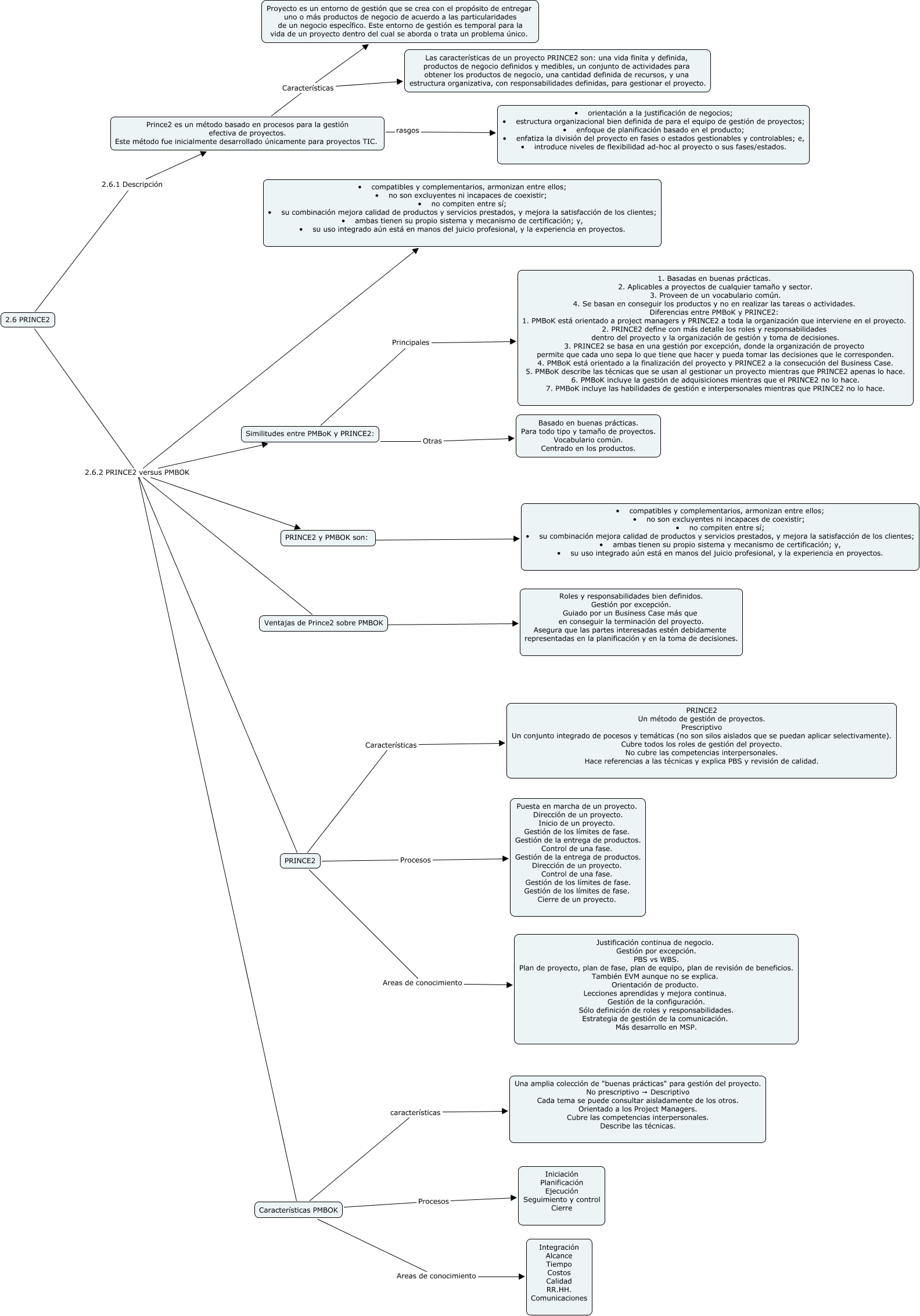 Este Cmap, tiene información relacionada con: Capítulo 2.4 .- Gestión de proyectos PRINCE2, Características PMBOK Areas de conocimiento Integración Alcance Tiempo Costos Calidad RR.HH. Comunicaciones, PRINCE2 Características PRINCE2 Un método de gestión de proyectos. Prescriptivo Un conjunto integrado de pocesos y temáticas (no son silos aislados que se puedan aplicar selectivamente). Cubre todos los roles de gestión del proyecto. No cubre las competencias interpersonales. Hace referencias a las técnicas y explica PBS y revisión de calidad., 2.6 PRINCE2 2.6.2 PRINCE2 versus PMBOK PRINCE2, Características PMBOK Procesos Iniciación Planificación Ejecución Seguimiento y control Cierre, Similitudes entre PMBoK y PRINCE2: Principales 1. Basadas en buenas prácticas. 2. Aplicables a proyectos de cualquier tamaño y sector. 3. Proveen de un vocabulario común. 4. Se basan en conseguir los productos y no en realizar las tareas o actividades. Diferencias entre PMBoK y PRINCE2: 1. PMBoK está orientado a project managers y PRINCE2 a toda la organización que interviene en el proyecto. 2. PRINCE2 define con más detalle los roles y responsabilidades dentro del proyecto y la organización de gestión y toma de decisiones. 3. PRINCE2 se basa en una gestión por excepción, donde la organización de proyecto permite que cada uno sepa lo que tiene que hacer y pueda tomar las decisiones que le corresponden. 4. PMBoK está orientado a la finalización del proyecto y PRINCE2 a la consecución del Business Case. 5. PMBoK describe las técnicas que se usan al gestionar un proyecto mientras que PRINCE2 apenas lo hace. 6. PMBoK incluye la gestión de adquisiciones mientras que el PRINCE2 no lo hace. 7. PMBoK incluye las habilidades de gestión e interpersonales mientras que PRINCE2 no lo hace., Prince2 es un método basado en procesos para la gestión efectiva de proyectos. Este método fue inicialmente desarrollado únicamente para proyectos TIC. Características Proyecto es un entorno de gestión que se crea con el propósito de entregar uno o más productos de negocio de acuerdo a las particularidades de un negocio específico. Este entorno de gestión es temporal para la vida de un proyecto dentro del cual se aborda o trata un problema único., PRINCE2 Procesos Puesta en marcha de un proyecto. Dirección de un proyecto. Inicio de un proyecto. Gestión de los límites de fase. Gestión de la entrega de productos. Control de una fase. Gestión de la entrega de productos. Dirección de un proyecto. Control de una fase. Gestión de los límites de fase. Gestión de los límites de fase. Cierre de un proyecto., 2.6 PRINCE2 2.6.2 PRINCE2 versus PMBOK PRINCE2 y PMBOK son:, 2.6 PRINCE2 2.6.1 Descripción Prince2 es un método basado en procesos para la gestión efectiva de proyectos. Este método fue inicialmente desarrollado únicamente para proyectos TIC., 2.6 PRINCE2 2.6.2 PRINCE2 versus PMBOK • compatibles y complementarios, armonizan entre ellos; • no son excluyentes ni incapaces de coexistir; • no compiten entre sí; • su combinación mejora calidad de productos y servicios prestados, y mejora la satisfacción de los clientes; • ambas tienen su propio sistema y mecanismo de certificación; y, • su uso integrado aún está en manos del juicio profesional, y la experiencia en proyectos., Prince2 es un método basado en procesos para la gestión efectiva de proyectos. Este método fue inicialmente desarrollado únicamente para proyectos TIC. rasgos • orientación a la justificación de negocios; • estructura organizacional bien definida de para el equipo de gestión de proyectos; • enfoque de planificación basado en el producto; • enfatiza la división del proyecto en fases o estados gestionables y controlables; e, • introduce niveles de flexibilidad ad-hoc al proyecto o sus fases/estados., 2.6 PRINCE2 2.6.2 PRINCE2 versus PMBOK Características PMBOK, PRINCE2 y PMBOK son: ???? • compatibles y complementarios, armonizan entre ellos; • no son excluyentes ni incapaces de coexistir; • no compiten entre sí; • su combinación mejora calidad de productos y servicios prestados, y mejora la satisfacción de los clientes; • ambas tienen su propio sistema y mecanismo de certificación; y, • su uso integrado aún está en manos del juicio profesional, y la experiencia en proyectos., Prince2 es un método basado en procesos para la gestión efectiva de proyectos. Este método fue inicialmente desarrollado únicamente para proyectos TIC. Características Las características de un proyecto PRINCE2 son: una vida finita y definida, productos de negocio definidos y medibles, un conjunto de actividades para obtener los productos de negocio, una cantidad definida de recursos, y una estructura organizativa, con responsabilidades definidas, para gestionar el proyecto., Similitudes entre PMBoK y PRINCE2: Otras Basado en buenas prácticas. Para todo tipo y tamaño de proyectos. Vocabulario común. Centrado en los productos., 2.6 PRINCE2 2.6.2 PRINCE2 versus PMBOK Ventajas de Prince2 sobre PMBOK, PRINCE2 Areas de conocimiento Justificación continua de negocio. Gestión por excepción. PBS vs WBS. Plan de proyecto, plan de fase, plan de equipo, plan de revisión de beneficios. También EVM aunque no se explica. Orientación de producto. Lecciones aprendidas y mejora continua. Gestión de la configuración. Sólo definición de roles y responsabilidades. Estrategia de gestión de la comunicación. Más desarrollo en MSP., 2.6 PRINCE2 2.6.2 PRINCE2 versus PMBOK Similitudes entre PMBoK y PRINCE2:, Ventajas de Prince2 sobre PMBOK ???? Roles y responsabilidades bien definidos. Gestión por excepción. Guiado por un Business Case más que en conseguir la terminación del proyecto. Asegura que las partes interesadas estén debidamente representadas en la planificación y en la toma de decisiones., Características PMBOK características Una amplia colección de "buenas prácticas" para ge