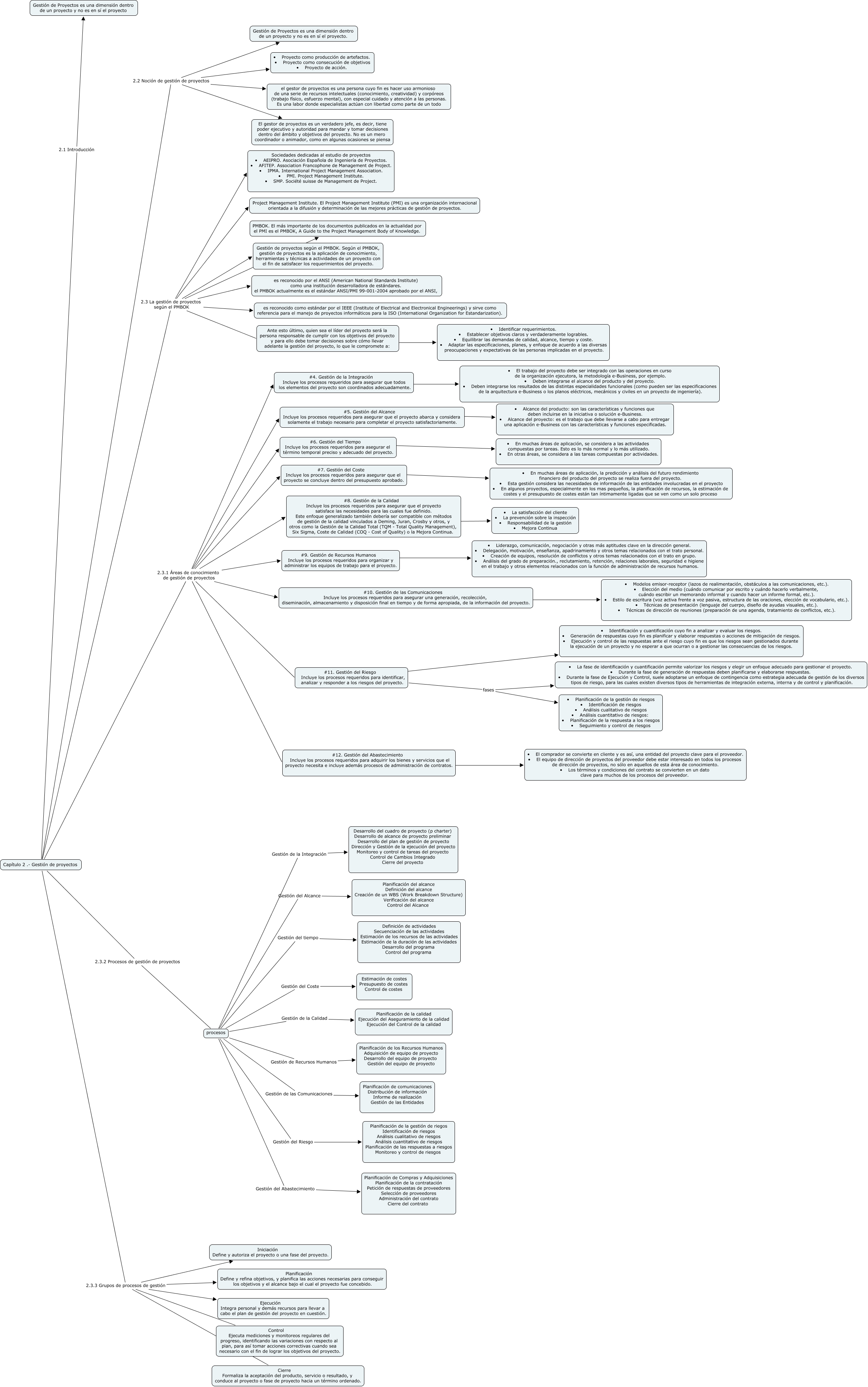 Este Cmap, tiene información relacionada con: Capítulo 2.1 .- Gestión de proyectos PMBOK, Capítulo 2 .- Gestión de proyectos 2.3 La gestión de proyectos según el PMBOK Gestión de proyectos según el PMBOK. Según el PMBOK, gestión de proyectos es la aplicación de conocimiento, herramientas y técnicas a actividades de un proyecto con el fin de satisfacer los requerimientos del proyecto., Capítulo 2 .- Gestión de proyectos 2.3.1 Áreas de conocimiento de gestión de proyectos #10. Gestión de las Comunicaciones Incluye los procesos requeridos para asegurar una generación, recolección, diseminación, almacenamiento y disposición final en tiempo y de forma apropiada, de la información del proyecto., #10. Gestión de las Comunicaciones Incluye los procesos requeridos para asegurar una generación, recolección, diseminación, almacenamiento y disposición final en tiempo y de forma apropiada, de la información del proyecto. ???? • Modelos emisor-receptor (lazos de realimentación, obstáculos a las comunicaciones, etc.). • Elección del medio (cuándo comunicar por escrito y cuándo hacerlo verbalmente, cuándo escribir un memorando informal y cuando hacer un informe formal, etc.). • Estilo de escritura (voz activa frente a voz pasiva, estructura de las oraciones, elección de vocabulario, etc.). • Técnicas de presentación (lenguaje del cuerpo, diseño de ayudas visuales, etc.). • Técnicas de dirección de reuniones (preparación de una agenda, tratamiento de conflictos, etc.)., procesos Gestión del Alcance Planificación del alcance Definición del alcance Creación de un WBS (Work Breakdown Structure) Verificación del alcance Control del Alcance, Capítulo 2 .- Gestión de proyectos 2.3 La gestión de proyectos según el PMBOK es reconocido por el ANSI (American National Standards Institute) como una institución desarrolladora de estándares. el PMBOK actualmente es el estándar ANSI/PMI 99-001-2004 aprobado por el ANSI,, procesos Gestión del Abastecimiento Planificación de Compras y Adquisiciones Planificación de la contratación Petición de respuestas de proveedores Selección de proveedores Administración del contrato Cierre del contrato, #6. Gestión del Tiempo Incluye los procesos requeridos para asegurar el término temporal preciso y adecuado del proyecto. ???? • En muchas áreas de aplicación, se considera a las actividades compuestas por tareas. Esto es lo más normal y lo más utilizado. • En otras áreas, se considera a las tareas compuestas por actividades., Ante esto último, quien sea el líder del proyecto será la persona responsable de cumplir con los objetivos del proyecto y para ello debe tomar decisiones sobre cómo llevar adelante la gestión del proyecto, lo que le compromete a: ???? • Identificar requerimientos. • Establecer objetivos claros y verdaderamente logrables. • Equilibrar las demandas de calidad, alcance, tiempo y coste. • Adaptar las especificaciones, planes, y enfoque de acuerdo a las diversas preocupaciones y expectativas de las personas implicadas en el proyecto., Capítulo 2 .- Gestión de proyectos 2.2 Noción de gestión de proyectos Gestión de Proyectos es una dimensión dentro de un proyecto y no es en sí el proyecto., Capítulo 2 .- Gestión de proyectos 2.3.2 Procesos de gestión de proyectos procesos, Capítulo 2 .- Gestión de proyectos 2.2 Noción de gestión de proyectos • Proyecto como producción de artefactos. • Proyecto como consecución de objetivos • Proyecto de acción., Capítulo 2 .- Gestión de proyectos 2.3.1 Áreas de conocimiento de gestión de proyectos #6. Gestión del Tiempo Incluye los procesos requeridos para asegurar el término temporal preciso y adecuado del proyecto., Capítulo 2 .- Gestión de proyectos 2.3 La gestión de proyectos según el PMBOK es reconocido como estándar por el IEEE (Institute of Electrical and Electronical Engineerings) y sirve como referencia para el manejo de proyectos informáticos para la ISO (International Organization for Estandarization)., Capítulo 2 .- Gestión de proyectos 2.3.3 Grupos de procesos de gestión Iniciación Define y autoriza el proyecto o una fase del proyecto., Capítulo 2 .- Gestión de proyectos 2.3.1 Áreas de conocimiento de gestión de proyectos #5. Gestión del Alcance Incluye los procesos requeridos para asegurar que el proyecto abarca y considera solamente el trabajo necesario para completar el proyecto satisfactoriamente., #11. Gestión del Riesgo Incluye los procesos requeridos para identificar, analizar y responder a los riesgos del proyecto. fases • Planificación de la gestión de riesgos • Identificación de riesgos • Análisis cualitativo de riesgos • Análisis cuantitativo de riesgos: • Planificación de la respuesta a los riesgos • Seguimiento y control de riesgos, Capítulo 2 .- Gestión de proyectos 2.3.3 Grupos de procesos de gestión Control Ejecuta mediciones y monitoreos regulares del progreso, identificando las variaciones con respecto al plan, para así tomar acciones correctivas cuando sea necesario con el fin de lograr los objetivos del proyecto., Capítulo 2 .- Gestión de proyectos 2.3 La gestión de proyectos según el PMBOK Ante esto último, quien sea el líder del proyecto será la persona responsable de cumplir con los objetivos del proyecto y para ello debe tomar decisiones sobre cómo llevar adelante la gestión del proyecto, lo que le compromete a:, Capítulo 2 .- Gestión de proyectos 2.3 La gestión de proyectos según el PMBOK Sociedades dedicadas al estudio de proyectos • AEIPRO. Asociación Española de Ingeniería de Proyectos. • AFITEP. Association Francophone de Management de Project. • IPMA. International Project Management Association. • PMI. Project Management Institute. • SMP. Société suisse de Management de Project., procesos Gestión de las Comunicaciones Planificación de comunicaciones Distribución de información Informe de realización 