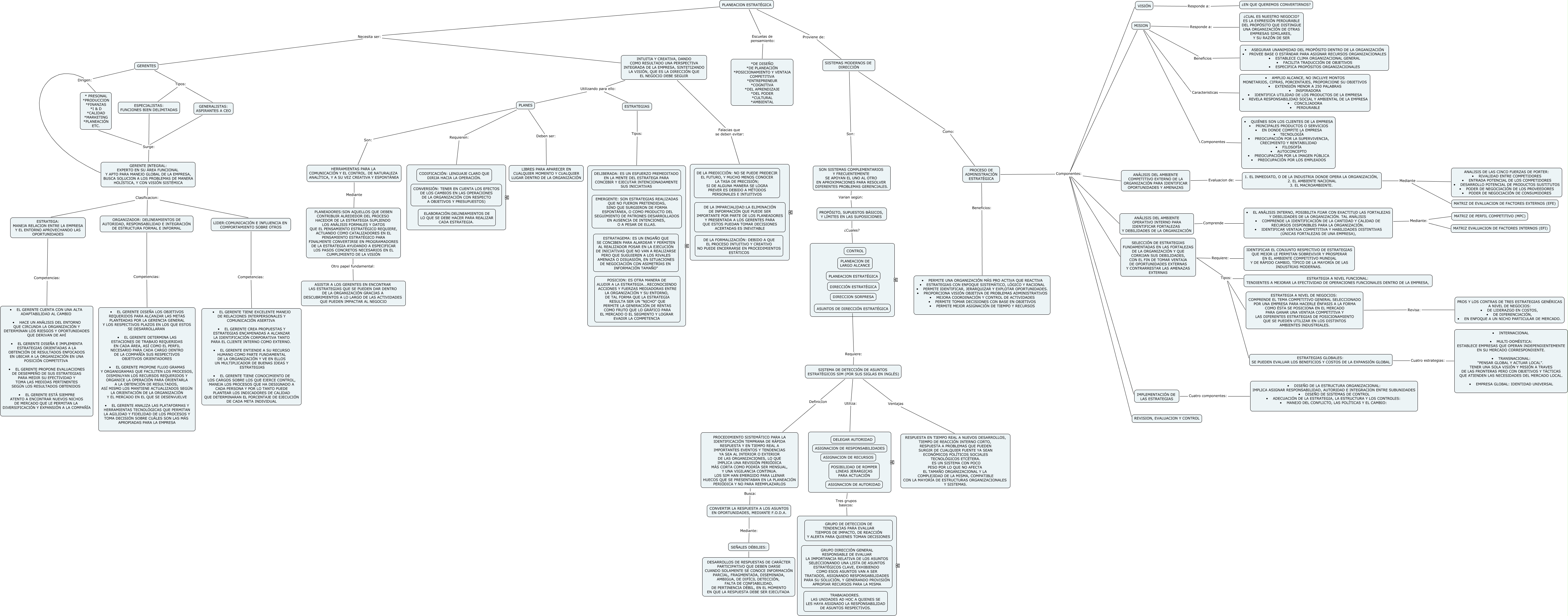 Este Cmap, tiene información relacionada con: GUIA 1 GERENCIA, PLANEACION ESTRATÉGICA Proviene de: SISTEMAS MODERNOS DE DIRECCIÓN, GERENTE INTEGRAL: EXPERTO EN SU ÁREA FUNCIONAL Y APTO PARA MANEJO GLOBAL DE LA EMPRESA, BUSCA SOLUCION A LOS PROBLEMAS DE MANERA HOLÍSTICA, Y CON VISIÓN SISTÉMICA Clasificacion: LIDER:COMUNICACIÓN E INFLUENCIA EN COMPORTAMIENTO SOBRE OTROS, PROCEDIMIENTO SISTEMÁTICO PARA LA IDENTIFICACIÓN TEMPRANA DE RÁPIDA RESPUESTA Y EN TIEMPO REAL A IMPORTANTES EVENTOS Y TENDENCIAS YA SEA AL INTERIOR O EXTERIOR DE LAS ORGANIZACIONES, LO QUE IMPLICA UNA REVISIÓN PERIÓDICA MÁS CORTA COMO PODRÍA SER MENSUAL, Y UNA VIGILANCIA CONTINUA. LOS SIM HAN EMERGIDO PARA LLENAR HUECOS QUE SE PRESENTABAN EN LA PLANEACIÓN PERIÓDICA Y NO PARA REEMPLAZARLOS Busca: CONVERTIR LA RESPUESTA A LOS ASUNTOS EN OPORTUNIDADES, MEDIANTE F.O.D.A., ESTRATEGIAS GLOBALES: SE PUEDEN EVALUAR LOS BENEFICIOS Y COSTOS DE LA EXPANSIÓN GLOBAL Cuatro estrategias: • INTERNACIONAL • MULTI-DOMÉSTICA: ESTABLECE EMPRESAS QUE OPERAN INDEPENDIENTEMENTE EN SU MERCADO CORRESPONDIENTE. • TRANSNACIONAL: “PENSAR GLOBAL Y ACTUAR LOCAL”. TENER UNA SOLA VISIÓN Y MISIÓN A TRAVES DE LAS FRONTERAS PERO CON OBJETIVOS Y TÁCTICAS QUE ATIENDEN LAS NECESIDADES DEL MERCADO LOCAL. • EMPRESA GLOBAL: IDENTIDAD UNIVERSAL, GERENTE INTEGRAL: EXPERTO EN SU ÁREA FUNCIONAL Y APTO PARA MANEJO GLOBAL DE LA EMPRESA, BUSCA SOLUCION A LOS PROBLEMAS DE MANERA HOLÍSTICA, Y CON VISIÓN SISTÉMICA Clasificacion: ORGANIZADOR: DELINEAMIENTOS DE AUTORIDAD, RESPONSABILIDAD E INTEGRACIÓN DE ESTRUCTURA FORMAL E INFORMAL, ESTRATEGIA A NIVEL DE NEGOCIOS: COMPRENDE EL TEMA COMPETITIVO GENERAL SELECCIONADO POR UNA EMPRESA PARA HACERLE ÉNFASIS A LA FORMA COMO ÉSTA SE POSICIONA EN EL MERCADO PARA GANAR UNA VENTAJA COMPETITIVA Y LAS DIFERENTES ESTRATEGIAS DE POSICIONAMIENTO QUE SE PUEDEN UTILIZAR EN LOS DISTINTOS AMBIENTES INDUSTRIALES. Revisa: PROS Y LOS CONTRAS DE TRES ESTRATEGIAS GENÉRICAS A NIVEL DE NEGOCIOS: • DE LIDERAZGO EN COSTOS, • DE DIFERENCIACIÓN, • EN ENFOQUE A UN NICHO PARTICULAR DE MERCADO., 1. EL INMEDIATO, O DE LA INDUSTRIA DONDE OPERA LA ORGANIZACIÓN, 2. EL AMBIENTE NACIONAL 3. EL MACROAMBIENTE. Mediante ANALISIS DE LAS CINCO FUERZAS DE PORTER: • RIVALIDAD ENTRE COMPETIDORES • ENTRADA POTENCIAL DE LOS COMPETIDORES • DESARROLLO POTENCIAL DE PRODUCTOS SUSTITUTOS • PODER DE NEGOCIACIÓN DE LOS PROVEEDORES • PODER DE NEGOCIACIÓN DE CONSUMIDORES, INTUITIA Y CREATIVA, DANDO COMO RESULTADO UNA PERSPECTIVA INTEGRADA DE LA EMPRESA, SINTETIZANDO LA VISIÓN, QUE ES LA DIRECCIÓN QUE EL NEGOCIO DEBE SEGUIR Utilizando para ello: PLANES, GERENTES Tipos: ESPECIALISTAS: FUNCIONES BIEN DELIMITADAS, ANÁLISIS DEL AMBIENTE OPERATIVO INTERNO PARA IDENTIFICAR FORTALEZAS Y DEBILIDADES DE LA ORGANIZACIÓN Comprende • EL ANÁLISIS INTERNO, POSIBILITA FIJAR CON EXACTITUD LAS FORTALEZAS Y DEBILIDADES DE LA ORGANIZACIÓN. TAL ANÁLISIS • COMPRENDE LA IDENTIFICACIÓN DE LA CANTIDAD Y CALIDAD DE RECURSOS DISPONIBLES PARA LA ORGANIZACIÓN. • IDENTIFICAR VENTAJA COMPETITIVA Y HABILIDADES DISTINTIVAS (ÚNICAS FORTALEZAS DE UNA EMPRESA),, GERENTES Tipos: GENERALISTAS: ASPIRANTES A CEO, ANÁLISIS DEL AMBIENTE COMPETITIVO EXTERNO DE LA ORGANIZACIÓN PARA IDENTIFICAR OPORTUNIDADES Y AMENAZAS Evaluacion de: 1. EL INMEDIATO, O DE LA INDUSTRIA DONDE OPERA LA ORGANIZACIÓN, 2. EL AMBIENTE NACIONAL 3. EL MACROAMBIENTE., SISTEMAS MODERNOS DE DIRECCIÓN Como: PROCESO DE ADMINISTRACIÓN ESTRATÉGICA, MISION Componentes • QUIÉNES SON LOS CLIENTES DE LA EMPRESA • PRINCIPALES PRODUCTOS O SERVICIOS • EN DONDE COMPITE LA EMPRESA • TECNOLOGÍA • PREOCUPACIÓN POR LA SUPERVIVENCIA, CRECIMIENTO Y RENTABILIDAD • FILOSOFÍA • AUTOCONCEPTO • PREOCUPACIÓN POR LA IMAGEN PÚBLICA • PREOCUPACIÓN POR LOS EMPLEADOS, ORGANIZADOR: DELINEAMIENTOS DE AUTORIDAD, RESPONSABILIDAD E INTEGRACIÓN DE ESTRUCTURA FORMAL E INFORMAL Competencias: • EL GERENTE DISEÑA LOS OBJETIVOS REQUERIDOS PARA ALCANZAR LAS METAS PLANTEADAS POR LA GERENCIA GENERAL Y LOS RESPECTIVOS PLAZOS EN LOS QUE ESTOS SE DESARROLLARAN • EL GERENTE DETERMINA LAS ESTACIONES DE TRABAJO REQUERIDAS EN CADA ÁREA, ASÍ COMO EL PERFIL NECESARIO PARA CADA CARGO DENTRO DE LA COMPAÑÍA SUS RESPECTIVOS OBJETIVOS ORIENTADORES • EL GERENTE PROPONE FLUJO GRAMAS Y ORGANIGRAMAS QUE FACILITEN LOS PROCESOS, DISMINUYAN LOS RECURSOS REQUERIDOS Y ORGANICE LA OPERACIÓN PARA ORIENTARLA A LA OBTENCIÓN DE RESULTADOS, ASÍ MISMO LOS MANTIENE ACTUALIZADOS SEGÚN LA ORIENTACIÓN DE LA ORGANIZACIÓN Y EL MERCADO EN EL QUE SE DESENVUELVE • EL GERENTE ANALIZA LAS PLATAFORMAS Y HERRAMIENTAS TECNOLÓGICAS QUE PERMITAN LA AGILIDAD Y FIDELIDAD DE LOS PROCESOS Y TOMA DECISIÓN SOBRE CUÁLES SON LAS MÁS APROPIADAS PARA LA EMPRESA, SISTEMA DE DETECCIÓN DE ASUNTOS ESTRATÉGICOS SIM (POR SUS SIGLAS EN INGLÉS) Utiliza: ????, SISTEMA DE DETECCIÓN DE ASUNTOS ESTRATÉGICOS SIM (POR SUS SIGLAS EN INGLÉS) Ventajas RESPUESTA EN TIEMPO REAL A NUEVOS DESARROLLOS, TIEMPO DE REACCIÓN INTERNO CORTO, RESPUESTA A PROBLEMAS QUE PUEDEN SURGIR DE CUALQUIER FUENTE YA SEAN ECONÓMICOS POLÍTICOS SOCIALES TECNOLÓGICOS ETCÉTERA. ES UN SISTEMA CON POCO PESO POR LO QUE NO AFECTA EL TAMAÑO ORGANIZACIONAL Y LA COMPLEJIDAD DE LA MISMA, COMPATIBLE CON LA MAYORÍA DE ESTRUCTURAS ORGANIZACIONALES Y SISTEMAS., PROCESO DE ADMINISTRACIÓN ESTRATÉGICA Componentes: VISIÓN, • EL ANÁLISIS INTERNO, POSIBILITA FIJAR CON EXACTITUD LAS FORTALEZAS Y DEBILIDADES DE LA ORGANIZACIÓN. TAL ANÁLISIS • COMPRENDE LA IDENTIFICACIÓN DE LA CANTIDAD Y CALIDAD DE RECURSOS DISPONIBLES PARA LA ORGANIZACIÓN. • IDENTIFICAR VENTAJA COMPETITIVA Y HABILIDADES DISTINTIVAS (ÚNICAS FORTALEZAS DE UNA EMPRESA), Mediante: MATRIZ DE PERFIL COMPETITIVO (MPC), SEÑALES DÉBILIES: Son: DESARROLLOS DE RESPUESTAS DE CARÁCTER PARTICIPATIVO QUE DEBEN DARSE CUANDO SOLAMENTE SE CONOCE INFORMACIÓN PARCIAL, FRAGMENTADA, DISEMINADA, AMBIGUA, DE DI