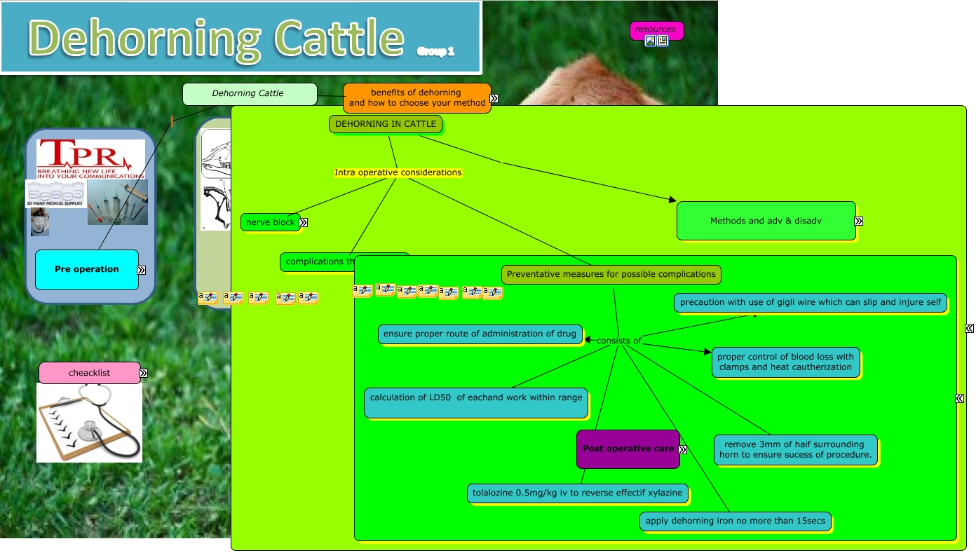 This Concept Map, created with IHMC CmapTools, has information related to: dehorning lab, nerve block consists of method, Any insecticides that are used as part of a fly control program must be labeled and registered for the intended use. In animal production facilities extreme caution should be exercised to be sure that only approved insecticides are used, and that label instructions and restrictions are followed. There are frequent changes in the insecticides approved and labeled for fly control by the different application methods and the latest information should be obtained. ???? Larviciding can also be accomplished by incorporating an insecticide into animal feed. Incorporating an insecticide into the water has been less satisfactory due to the irregular amounts of water consumption and difficulty in maintaining the proper dosage per animal. Although several chemicals have been experimentally effective for fly control in feces, most have not been registered for use. Often there are problems with residues in the animal tissues or products., nerve block consists of drugs used, type of block Cornual branch of the lacrimal nerve, Use of Gigli Wire Advantages 1. Fast cutting 2. Neat job done 3. Useful to remove horn scurs and to cut small horns before burning with hot iron, nerve block consists of type of block, Post Op complications Horn regrowth • Inadequate removal of the corium (horn-producing cells) will result in the regrowth of the horn, generally a partial growth that leads to scurs. Depending on the extent of the regrowth, the dehorning procedure may need to be repeated., Post Operative Care Topical Antibiotic Administration, mechanical 6-8 month old Technique 1. Close the handles together. 2. Place the jaws of the dehorner over the horn bud. The objective is to completely remove a ring of skin surrounding the horn base., mechanical button stage, Post Operative Care ???? Post Op complications, complications that can arise consists of improper usage of drugs, improper use of instruments consists of cutting to deep with Barnes dehorner. prolonged contact with dehorning iron. cutting improperly with gigli wire., Technique 1. Close the handles together. 2. Place the jaws of the dehorner over the horn bud. The objective is to completely remove a ring of skin surrounding the horn base. ???? Press the gouger gently against the head. Maintain the pressure and quickly spread the handles apart to remove the horn and skin. 4. Control bleeding by pulling the arteries with forceps or using a hot iron to cauterize the artery. 5. Clean and disinfect the jaws of the gouger between calves., DEHORNING IN CATTLE Intra operative considerations Preventative measures for possible complications, LINKS Gigli Wire Video, Post Op complications Flystrike • Dehorning method that leave an open wound should NOT but used during fly season. Paste and hot dehorning are acceptable anytime of year. • The use of a fly repellant may be warranted., Restrain the animal Hold ear out of the way Place the hot iron firmly against horn base Leave for 15 seconds Horns should have passed the button stage, nerve block consists of instruments, Post Op complications Pain • Animals should be monitored during and after the procedure for signs of unnecessary pain, such as vocalization, reluctance to move, and failure to nurse. Such animals should be treated with a systemic analgesic such as flunixin meglumine.