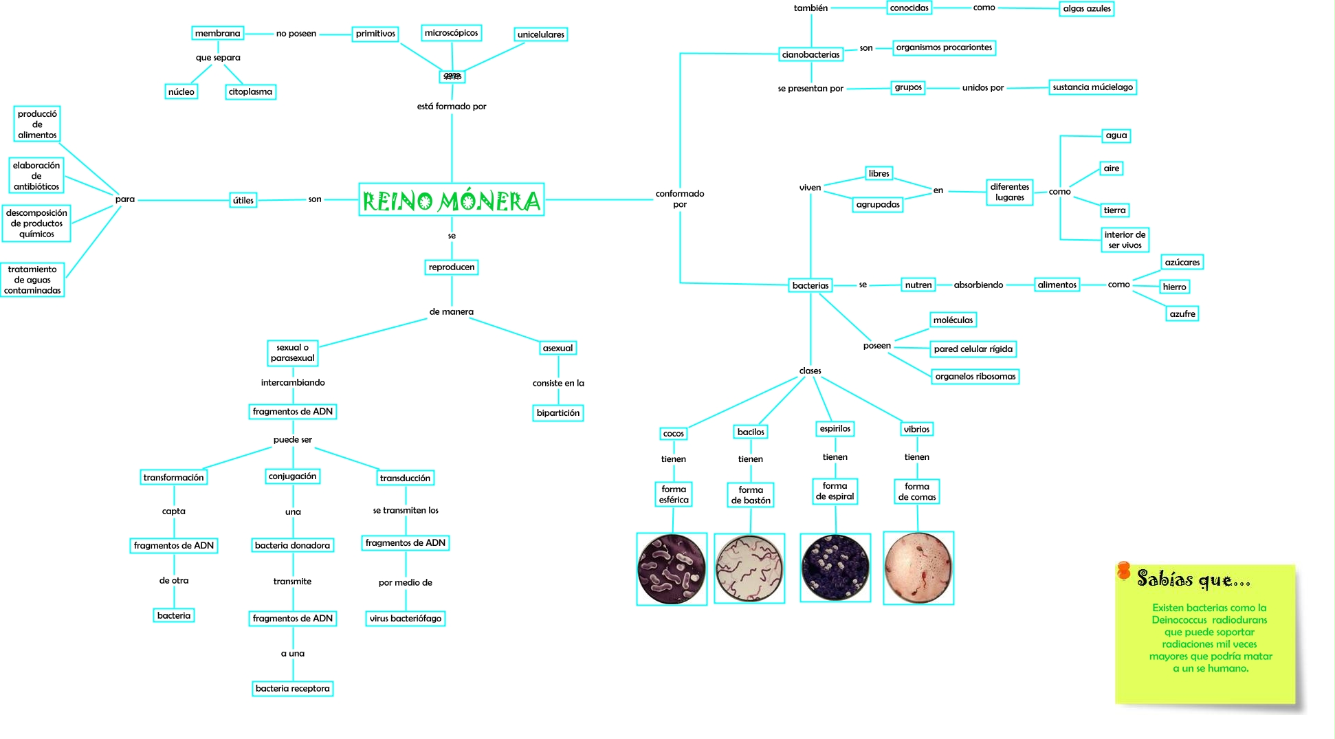 Este Cmap, tiene información relacionada con: Reino mónera, primitivos no poseen membrana, útiles para tratamiento de aguas contaminadas, bacterias viven libres, diferentes lugares como aire, bacterias poseen moléculas, bacterias clases vibrios, fragmentos de ADN puede ser conjugación, REINO MÓNERA se reproducen, agrupadas en diferentes lugares, conjugación una bacteria donadora, reproducen de manera sexual o parasexual, fragmentos de ADN a una bacteria receptora, útiles para elaboración de antibióticos, bacterias clases espirilos, REINO MÓNERA está formado por seres, bacteria donadora transmite fragmentos de ADN, forma de comas ????, bacterias viven agrupadas, alimentos como hierro, forma esférica ????