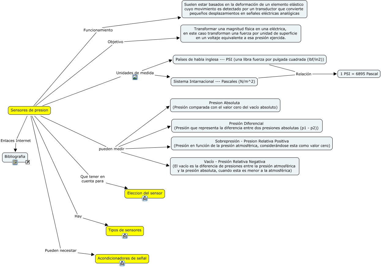 Este Cmap, tiene información relacionada con: SENSORES PRESIÓN, Sistema Intarnacional --- Pascales (N/m^2) Relación 1 PSI = 6895 Pascal, Sensores de presion Pueden necesitar Acondicionadores de señal, Sensores de presion Unidades de medida Sistema Intarnacional --- Pascales (N/m^2), Sensores de presion Que tener en cuenta para Eleccion del sensor, Sensores de presion pueden medir Sobrepresión - Presion Relativa Positiva (Presión en función de la presión atmosférica, considerándose esta como valor cero), Sensores de presion pueden medir Vacío - Presión Relativa Negativa (El vacío es la diferencia de presiones entre la presión atmosférica y la presión absoluta, cuando esta es menor a la atmosférica), Sensores de presion Enlaces Internet Bibliografia, Países de habla inglesa --- PSI (una libra fuerza por pulgada cuadrada (lbf/in2)) Relación 1 PSI = 6895 Pascal, Sensores de presion Hay Tipos de sensores, Sensores de presion Objetivo Transformar una magnitud física en una eléctrica, en este caso transforman una fuerza por unidad de superficie en un voltaje equivalente a esa presión ejercida., Sensores de presion Funcionamiento Suelen estar basados en la deformación de un elemento elástico cuyo movimiento es detectado por un transductor que convierte pequeños desplazamientos en señales eléctricas analógicas, Sensores de presion Unidades de medida Países de habla inglesa --- PSI (una libra fuerza por pulgada cuadrada (lbf/in2)), Sensores de presion pueden medir Presión Diferencial (Presión que representa la diferencia entre dos presiones absolutas (p1 - p2)), Sensores de presion pueden medir Presion Absoluta (Presión comparada con el valor cero del vacío absoluto)