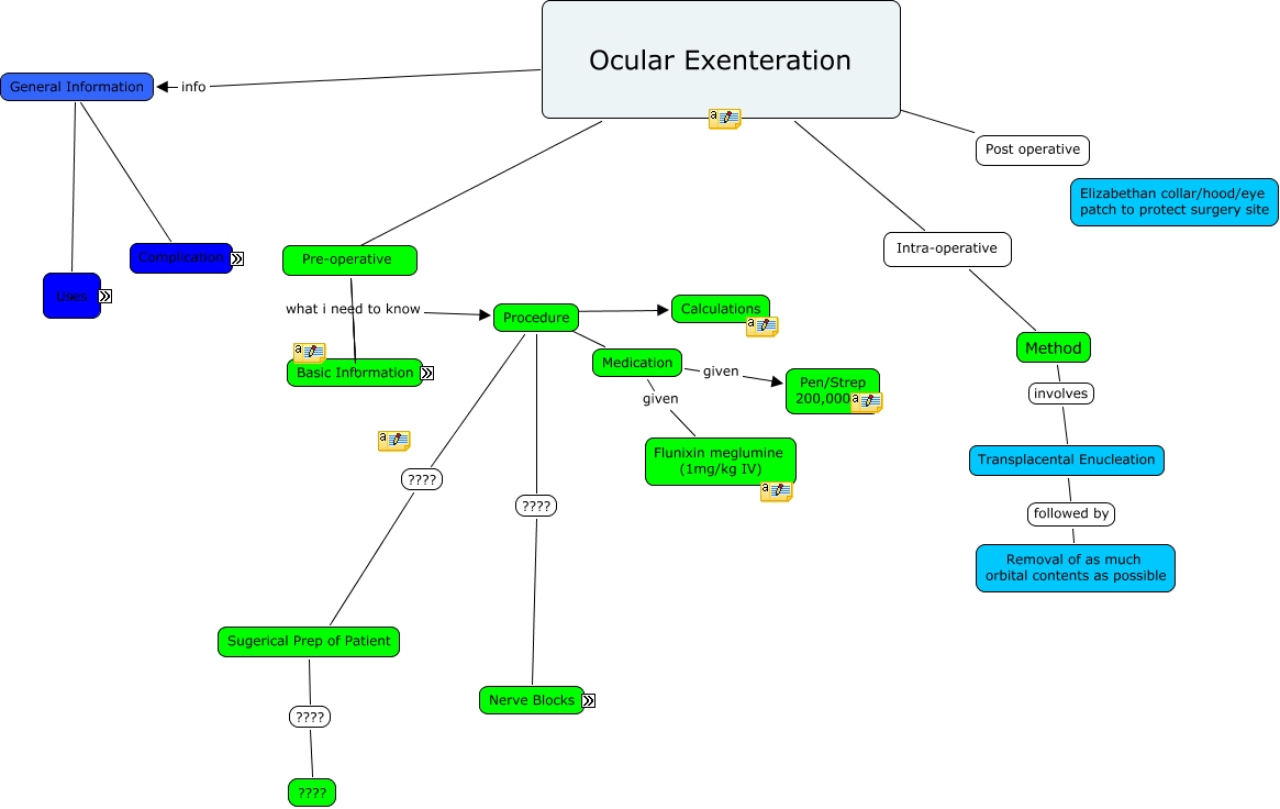 This Concept Map, created with IHMC CmapTools, has information related to: Eye Enucleation, Ocular Exenteration Intra-operative Method, Medication given Flunixin meglumine (1mg/kg IV), Ocular Exenteration ???? Post operative, Procedure ???? Nerve Blocks, 4 Point Retrobulbar Nerve Block 18 G needle is introduced through the skin on the dorsal, lateral, ventral and medial aspects of the eye. It is directed behind the glode using the bony orbit, Transplacental Enucleation followed by Removal of as much orbital contents as possible, Procedure ???? Calculations, Pre-operative what i need to know Signalment, Pre-operative what i need to know Procedure, Presence of ???? Neoplasm, Peterson's Nerve Block ???? Mydriasis indicates a successful nerve block, 4 Point Retrobulbar Nerve Block Mydriasis indicates a successful block, Ocular Exenteration info General Information, Ocular Exenteration ???? Pre-operative, Pre-operative ???? Primary Complaint, Method involves Transplacental Enucleation, 4 Point Retrobulbar Nerve Block Inject 5 to 10 mls of lidocaine in each site, Medication given Pen/Strep 200,000 IU, Alternative Blocks such as Ring Block, 4 Point Retrobulbar Nerve Block Needle enters through the conjunctiva to avoid contamination