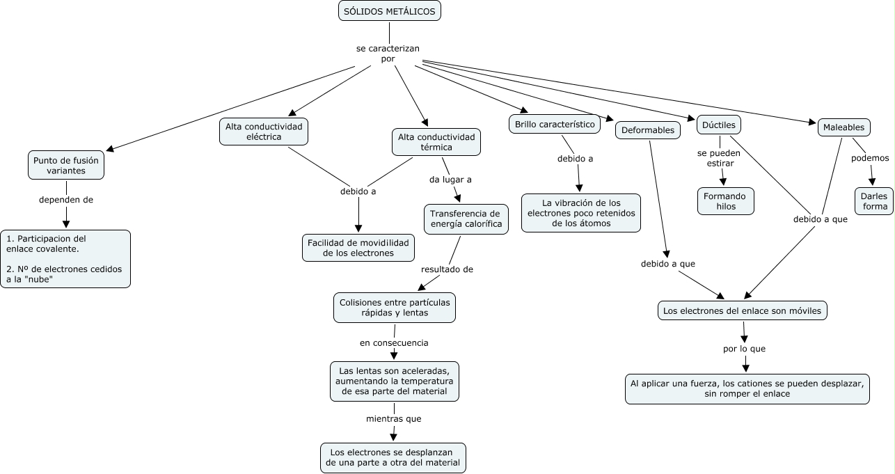 Este Cmap, tiene información relacionada con: solidos metalicos, SÓLIDOS METÁLICOS se caracterizan por Brillo característico, Deformables debido a que Los electrones del enlace son móviles, Las lentas son aceleradas, aumentando la temperatura de esa parte del material mientras que Los electrones se desplanzan de una parte a otra del material, Transferencia de energía calorífica resultado de Colisiones entre partículas rápidas y lentas, Alta conductividad térmica da lugar a Transferencia de energía calorífica, SÓLIDOS METÁLICOS se caracterizan por Maleables, SÓLIDOS METÁLICOS se caracterizan por Dúctiles, Alta conductividad eléctrica debido a Facilidad de movid¡lidad de los electrones, Punto de fusión variantes dependen de 1. Participacion del enlace covalente. 2. Nº de electrones cedidos a la "nube", Brillo característico debido a La vibración de los electrones poco retenidos de los átomos, SÓLIDOS METÁLICOS se caracterizan por Alta conductividad térmica, Colisiones entre partículas rápidas y lentas en consecuencia Las lentas son aceleradas, aumentando la temperatura de esa parte del material, SÓLIDOS METÁLICOS se caracterizan por Punto de fusión variantes, Maleables debido a que Los electrones del enlace son móviles, SÓLIDOS METÁLICOS se caracterizan por Alta conductividad eléctrica, SÓLIDOS METÁLICOS se caracterizan por Deformables, Alta conductividad térmica debido a Facilidad de movid¡lidad de los electrones, Dúctiles debido a que Los electrones del enlace son móviles, Los electrones del enlace son móviles por lo que Al aplicar una fuerza, los cationes se pueden desplazar, sin romper el enlace, Dúctiles se pueden estirar Formando hilos