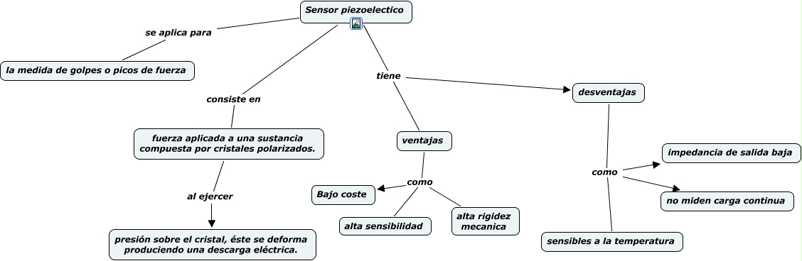 Este Cmap, tiene información relacionada con: piezoelectricos, Sensor piezoelectico consiste en fuerza aplicada a una sustancia compuesta por cristales polarizados., ventajas como alta rigidez mecanica, desventajas como impedancia de salida baja, Sensor piezoelectico tiene ventajas, fuerza aplicada a una sustancia compuesta por cristales polarizados. al ejercer presión sobre el cristal, éste se deforma produciendo una descarga eléctrica., Sensor piezoelectico se aplica para la medida de golpes o picos de fuerza, desventajas como no miden carga continua, Sensor piezoelectico tiene desventajas, ventajas como Bajo coste, ventajas como alta sensibilidad, desventajas como sensibles a la temperatura