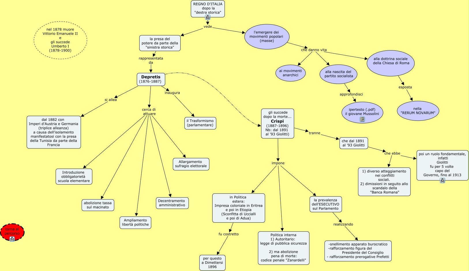 Questa Cmap, creata con IHMC CmapTools, contiene informazioni relative a: depretis crispi, che dal 1891 al '93 Giolitti che ebbe 1) diverso atteggiamento nei conflitti sociali. 2) dimissioni in seguito allo scandalo della "Banca Romana", Depretis (1876-1887) cerca di attuare Ampliamento libertà politiche, in Politica estera: Impresa coloniale in Eritrea e poi in Etiopia (Sconfitta di Uccialli e poi di Adua) fu costretto per questo a Dimettersi 1896, l'emergere dei movimenti popolari (masse) che danno vita alla nascita del partito socialista, Depretis (1876-1887) cerca di attuare abolizione tassa sul macinato, che dal 1891 al '93 Giolitti che ebbe poi un ruolo fondamentale, infatti Giolitti fu per 5 volte capo del Governo, fino al 1913, REGNO D'ITALIA dopo la "destra storica" vede l'emergere dei movimenti popolari (masse), REGNO D'ITALIA dopo la "destra storica" vede la presa del potere da parte della "sinistra storica", la presa del potere da parte della "sinistra storica" rappresentata da Depretis (1876-1887), Depretis (1876-1887) cerca di attuare Introduzione obbligatorietà scuola elementare, Depretis (1876-1887) cerca di attuare Decentramento amministrativo, gli succede dopo la morte... Crispi (1887-1896) Nb: dal 1891 al '93 Giolitti) impone la prevalenza dell'ESECUTIVO sul Parlamento, gli succede dopo la morte... Crispi (1887-1896) Nb: dal 1891 al '93 Giolitti) impone in Politica estera: Impresa coloniale in Eritrea e poi in Etiopia (Sconfitta di Uccialli e poi di Adua), gli succede dopo la morte... Crispi (1887-1896) Nb: dal 1891 al '93 Giolitti) impone Politica interna 1) Autoritario: legge di pubblica sicurezza 2) ma abolizione pena di morte: codice penale "Zanardelli", l'emergere dei movimenti popolari (masse) che danno vita ai movimenti anarchici, Depretis (1876-1887) cerca di attuare Allargamento sufragio elettorale, Depretis (1876-1887) gli succede dopo la morte... Crispi (1887-1896) Nb: dal 1891 al '93 Giolitti), l'emergere dei movimenti popolari (masse) che danno vita alla dottrina sociale della Chiesa di Roma, Depretis (1876-1887) inaugura il Trasformismo (parlamentare), la prevalenza dell'ESECUTIVO sul Parlamento realizzando -snellimento apparato burocratico -rafforzamento figura del Presidente del Consiglio - rafforzamento prerogative Prefetti