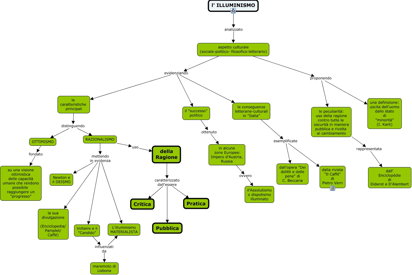 Questa Cmap, creata con IHMC CmapTools, contiene informazioni relative a: ILLUMINISMO, della Ragione caratterizzato dall'essere Pratica, RAZIONALISMO mettendo in evidenza Voltaire e il "Candido", della Ragione caratterizzato dall'essere Critica, aspetto culturale (sociale-politico- filosofico-letterario) proponendo una definizione: uscita dell'uomo dallo stato di "minorità" (I. Kant), aspetto culturale (sociale-politico- filosofico-letterario) proponendo le peculiarità: uso della ragione contro tutte le oscurità in maniera pubblica e rivolta al cambiamento, le peculiarità: uso della ragione contro tutte le oscurità in maniera pubblica e rivolta al cambiamento rappresentata dall' Enciclopédie di Diderot e D'Alambert, RAZIONALISMO mettendo in evidenza la sua divulgazione (Enciclopedia/ Pamplet/ Caffé), Voltaire e il "Candido" influenzati da maremoto di Lisbona, RAZIONALISMO mettendo in evidenza L'illuminismo MATERIALISTA, l' ILLUMINISMO analizzato aspetto culturale (sociale-politico- filosofico-letterario), il "successo" politico ottenuto in alcune zone Europee: Impero d'Austria, Russia, della Ragione caratterizzato dall'essere Pubblica, le conseguenze letterarie-culturali in "Italia" esemplificate dalla rivista "Il Caffé" di Pietro Verri, OTTIMISMO fondato su una visione ottimistica delle capacità umane che rendono possibile raggiungere un "progresso", in alcune zone Europee: Impero d'Austria, Russia ovvero il'Assolutismo o dispotismo illuminato, RAZIONALISMO mettendo in evidenza Newton e il DEISMO, le caratteristiche principali distinguendo RAZIONALISMO, aspetto culturale (sociale-politico- filosofico-letterario) evidenziando le caratteristiche principali, le caratteristiche principali distinguendo OTTIMISMO, RAZIONALISMO uso della Ragione