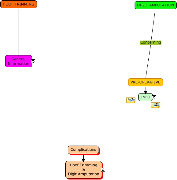 This Concept Map, created with IHMC CmapTools, has information related to: Hoof Trimming & Digit Amputation, Environment Equipment, Complications ???? Digit Amputation, Equipment Environment, PRE-OPERATIVE Consists Working area, HOOF TRIMMING General information Following initial distance exam and environmental assessment, Technique Veterinarian, Following initial distance exam and environmental assessment PHYSICAL EXAM, Before Equipment, Hoof trimming During, After Equipment, PHYSICAL EXAM TPR and overall appearance, Animal Veterinarian, Technique Technique, Equipment Equipment, Veterinarian Animal, Hoof exam Assessing anatomical and functional aspects, Methods & Indications looking at WHY TRIM?, Digit Amputation ???? Before, Precautions consider Owner, HOOF TRIMMING Concerning Methods & Indications