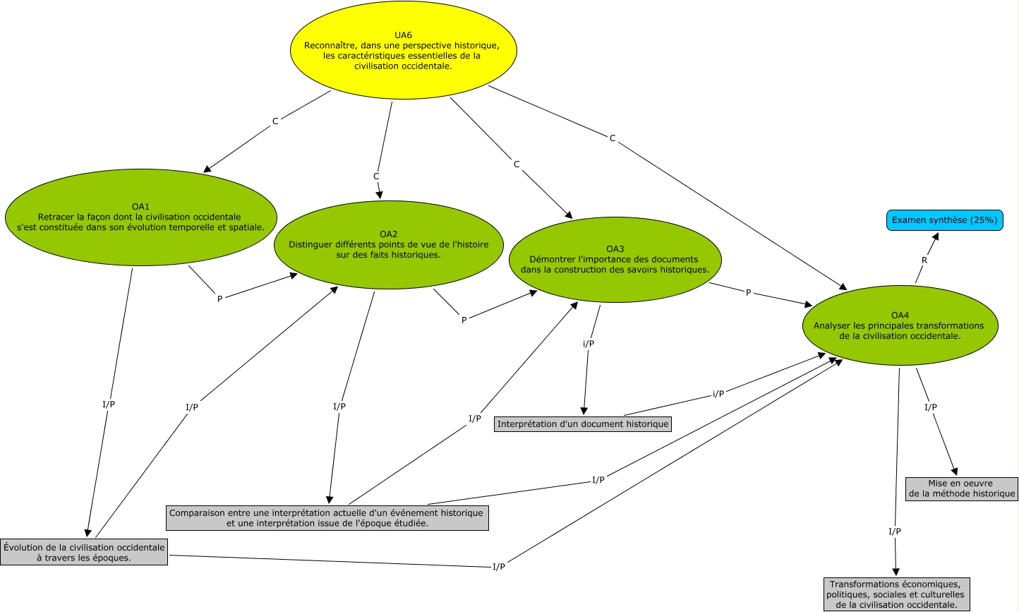 Cette carte de concepts créée avec IHMC CmapTools traite de: UA6, OA3 Démontrer l'importance des documents dans la construction des savoirs historiques. i/P Interprétation d'un document historique, Comparaison entre une interprétation actuelle d'un événement historique et une interprétation issue de l'époque étudiée. I/P OA4 Analyser les principales transformations de la civilisation occidentale., Comparaison entre une interprétation actuelle d'un événement historique et une interprétation issue de l'époque étudiée. I/P OA3 Démontrer l'importance des documents dans la construction des savoirs historiques., UA6 Reconnaître, dans une perspective historique, les caractéristiques essentielles de la civilisation occidentale. C OA1 Retracer la façon dont la civilisation occidentale s'est constituée dans son évolution temporelle et spatiale., OA4 Analyser les principales transformations de la civilisation occidentale. R Examen synthèse (25%), OA2 Distinguer différents points de vue de l'histoire sur des faits historiques. I/P Comparaison entre une interprétation actuelle d'un événement historique et une interprétation issue de l'époque étudiée., OA1 Retracer la façon dont la civilisation occidentale s'est constituée dans son évolution temporelle et spatiale. P OA2 Distinguer différents points de vue de l'histoire sur des faits historiques., UA6 Reconnaître, dans une perspective historique, les caractéristiques essentielles de la civilisation occidentale. C OA2 Distinguer différents points de vue de l'histoire sur des faits historiques., OA3 Démontrer l'importance des documents dans la construction des savoirs historiques. P OA4 Analyser les principales transformations de la civilisation occidentale., Évolution de la civilisation occidentale à travers les époques. I/P OA4 Analyser les principales transformations de la civilisation occidentale., OA1 Retracer la façon dont la civilisation occidentale s'est constituée dans son évolution temporelle et spatiale. I/P Évolution de la civilisation occidentale à travers les époques., OA2 Distinguer différents points de vue de l'histoire sur des faits historiques. P OA3 Démontrer l'importance des documents dans la construction des savoirs historiques., UA6 Reconnaître, dans une perspective historique, les caractéristiques essentielles de la civilisation occidentale. C OA3 Démontrer l'importance des documents dans la construction des savoirs historiques., OA4 Analyser les principales transformations de la civilisation occidentale. I/P Mise en oeuvre de la méthode historique, OA4 Analyser les principales transformations de la civilisation occidentale. I/P Transformations économiques, politiques, sociales et culturelles de la civilisation occidentale., UA6 Reconnaître, dans une perspective historique, les caractéristiques essentielles de la civilisation occidentale. C OA4 Analyser les principales transformations de la civilisation occidentale., Évolution de la civilisation occidentale à travers les époques. I/P OA2 Distinguer différents points de vue de l'histoire sur des faits historiques., Interprétation d'un document historique i/P OA4 Analyser les principales transformations de la civilisation occidentale.