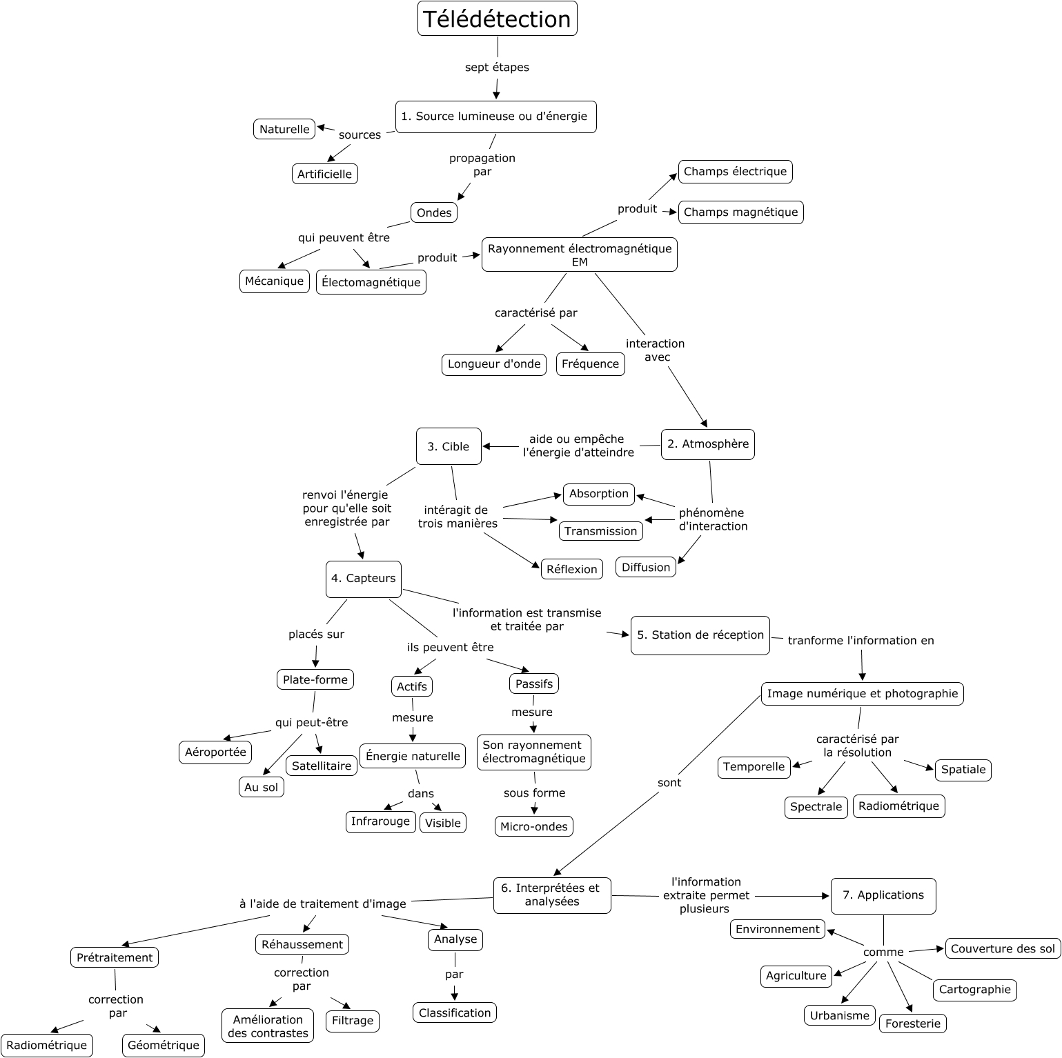 Cette carte de concepts créée avec IHMC CmapTools traite de: télédétection finale, Réhaussement correction par Amélioration des contrastes, 3. Cible renvoi l'énergie pour qu'elle soit enregistrée par 4. Capteurs, Rayonnement électromagnétique EM caractérisé par Longueur d'onde, Télédétection sept étapes 1. Source lumineuse ou d'énergie, 2. Atmosphère phénomène d'interaction Diffusion, Image numérique et photographie sont 6. Interprétées et analysées, 5. Station de réception tranforme l'information en Image numérique et photographie, 4. Capteurs ils peuvent être Passifs, Prétraitement correction par Géométrique, Image numérique et photographie caractérisé par la résolution Spectrale, 6. Interprétées et analysées à l'aide de traitement d'image Analyse, Passifs mesure Son rayonnement électromagnétique, Ondes qui peuvent être Électomagnétique, 1. Source lumineuse ou d'énergie propagation par Ondes, Actifs mesure Énergie naturelle, Énergie naturelle dans Infrarouge, 1. Source lumineuse ou d'énergie sources Naturelle, 6. Interprétées et analysées à l'aide de traitement d'image Prétraitement, 3. Cible intéragit de trois manières Transmission, 6. Interprétées et analysées à l'aide de traitement d'image Réhaussement