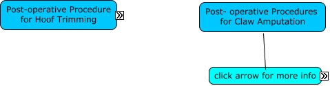 This Concept Map, created with IHMC CmapTools, has information related to: hoof trimming and declawing post op, Clean off excess adhesive. ,it can dry very sharp. Dried glue has acted as a knife and cut into the cows foot making the lameness worse. important links- web pg & video, Post- operative for hoof trimming bandage in cases of digital dermatis, nonirritant bacteriostatic agent (such as nitrofurazone or a sulfa preparation) should be applied as a topical dressing lesion can be protected and immobilized by binding the digits together with a bandage, Post- operative for hoof trimming mior injuries to the corium, Post- operative for hoof trimming footrot penicillin G, IM, for 3 days, removed in 2 or 3 days if tendon resection is performed, Post- operative for hoof trimming know abt the cow Cows that have a history of problems, prevent the metabolic and microbial causes of lameness try practice good hygiene, Post- operative Procedures for Claw Amputation what to do wound is covered with an antiseptic or antibiotic dressing, Post- operative for hoof trimming remove tourniquet (have on, no longer than an hour) ensure anesthesia has worn off, environment the cow must live in after surgery consider ight wrap to minimize painful contact with environmental objects, cows are exposed to causes of lameness during these times you will see the lameness develop two to three months later. how to do this trimming on a regular schedule, bandage applied to control hemorrhage bandage should be removed in 2 or 3 days, nonirritant bacteriostatic agent (such as nitrofurazone or a sulfa preparation) should be applied as a topical dressing application of gauze, cotton batting, or bandages is contraindicated, remove damage tissue above amputation if not outcome will be poor, topical tx mild antiseptic or antibiotic under a bandage remove 3-5 days, Post- operative for hoof trimming after trimming pain is severe, bandage applied to control hemorrhage bandage should be removed, Post- operative for hoof trimming severe liesions to corium, Cows are most susceptible to insults during high stress periods like calving and peak lactation cows are exposed to causes of lameness during these times you will see the lameness develop two to three months later.
