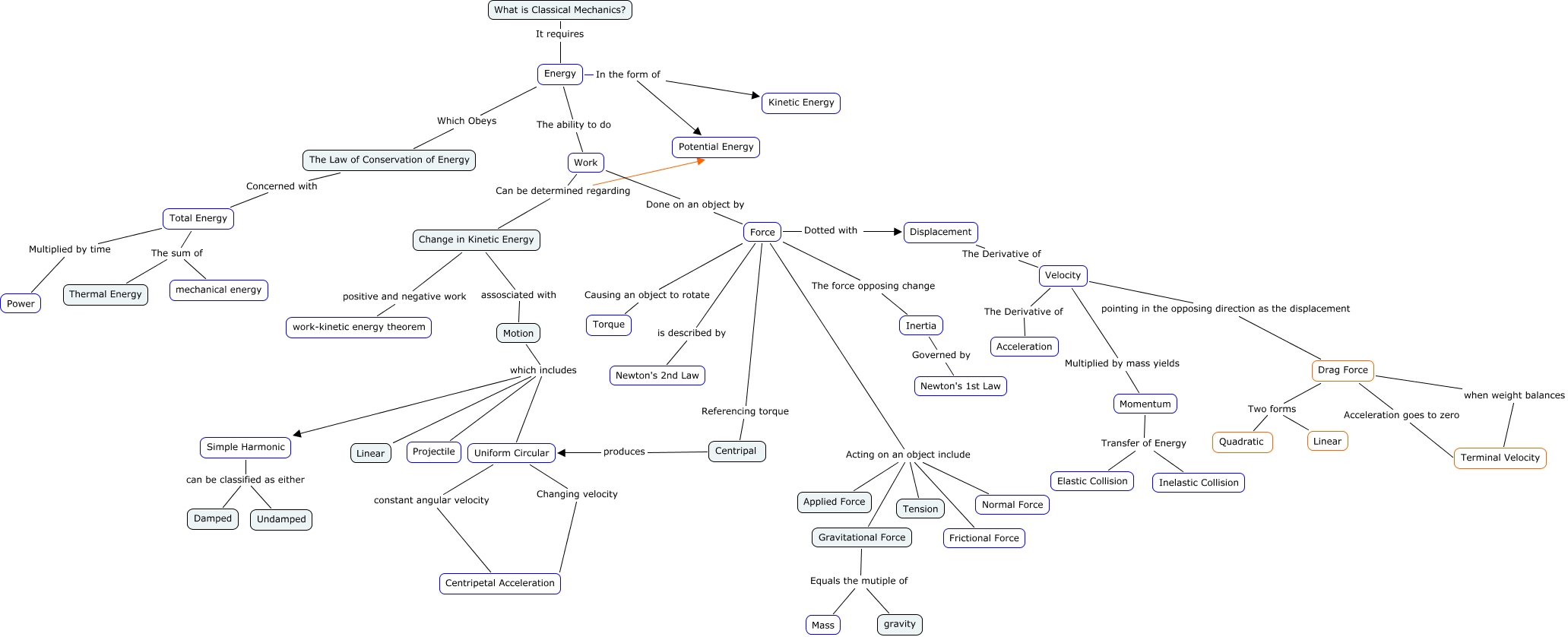This Concept Map, created with IHMC CmapTools, has information related to: Mechanics_Burton, What is Classical Mechanics? It requires Energy, Displacement The Derivative of Velocity, Momentum Transfer of Energy Elastic Collision, Force Dotted with Displacement, Energy The ability to do Work, Force Referencing torque Centripal, Force Acting on an object include Gravitational Force, Force Acting on an object include Normal Force, Energy Which Obeys The Law of Conservation of Energy, Gravitational Force Equals the mutiple of Mass, Energy In the form of Potential Energy, Energy In the form of Kinetic Energy, Motion which includes Projectile, Drag Force Acceleration goes to zero Terminal Velocity, Force Causing an object to rotate Torque, Velocity pointing in the opposing direction as the displacement Drag Force, Motion which includes Linear, Uniform Circular constant angular velocity Centripetal Acceleration, Force Acting on an object include Applied Force, Motion which includes Uniform Circular