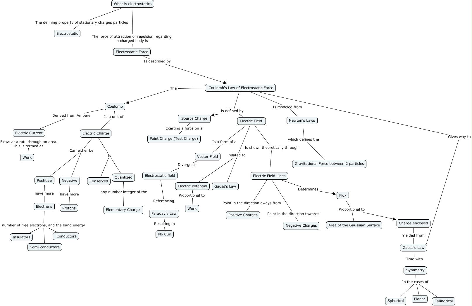 This Concept Map, created with IHMC CmapTools, has information related to: Electrostatics_Burton, Symmetry In the cases of Cylindrical, Electric Field Lines Point in the direction towards Negative Charges, Quantized any number integer of the Elementary Charge, Electric Charge Can either be Postitive, Coulomb Derived from Ampere Electric Current, Electrons number of free electrons, and the band energy Semi-conductors, Coulomb's Law of Electrostatic Force The Coulomb, Flux Proportional to Charge enclosed, Electric Current Flows at a rate through an area. This is termed as Work, Faraday's Law Resulting in No Curl, What is electrostatics The defining property of stationary charges particles Electrostatic, Coulomb's Law of Electrostatic Force is defined by Source Charge, Vector Field Divergent Electrostatic field, Electric Field Is shown theoretically through Electric Field Lines, Coulomb's Law of Electrostatic Force is defined by Electric Field, Electric Field Lines Determines Flux, Negative have more Protons, Electric Charge is Conserved, Electric Potential Proportional to Work, Electric Field Lines Point in the direction aways from Positive Charges