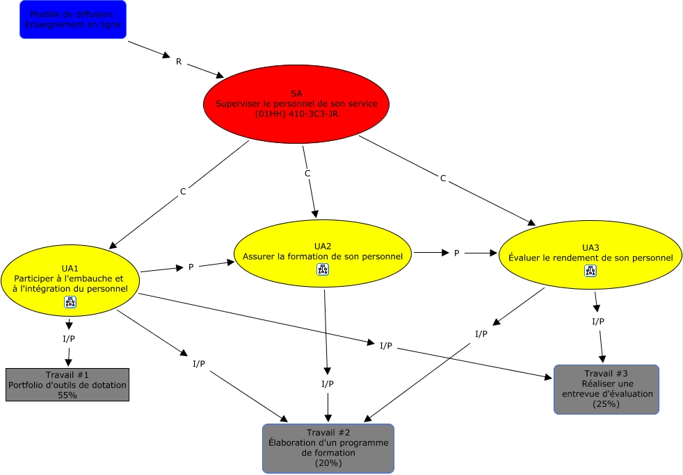 Cette carte de concepts créée avec IHMC CmapTools traite de: SA, SA Superviser le personnel de son service (01HH) 410-3C3-JR C UA3 Évaluer le rendement de son personnel, UA1 Participer à l'embauche et à l'intégration du personnel I/P Travail #1 Portfolio d'outils de dotation 55%, Modèle de diffusion: Enseignement en ligne R SA Superviser le personnel de son service (01HH) 410-3C3-JR, UA1 Participer à l'embauche et à l'intégration du personnel I/P Travail #2 Élaboration d'un programme de formation (20%), SA Superviser le personnel de son service (01HH) 410-3C3-JR C UA1 Participer à l'embauche et à l'intégration du personnel, UA1 Participer à l'embauche et à l'intégration du personnel P UA2 Assurer la formation de son personnel, UA1 Participer à l'embauche et à l'intégration du personnel I/P Travail #3 Réaliser une entrevue d'évaluation (25%), SA Superviser le personnel de son service (01HH) 410-3C3-JR C UA2 Assurer la formation de son personnel, UA2 Assurer la formation de son personnel P UA3 Évaluer le rendement de son personnel, UA3 Évaluer le rendement de son personnel I/P Travail #3 Réaliser une entrevue d'évaluation (25%), UA2 Assurer la formation de son personnel I/P Travail #2 Élaboration d'un programme de formation (20%), UA3 Évaluer le rendement de son personnel I/P Travail #2 Élaboration d'un programme de formation (20%)