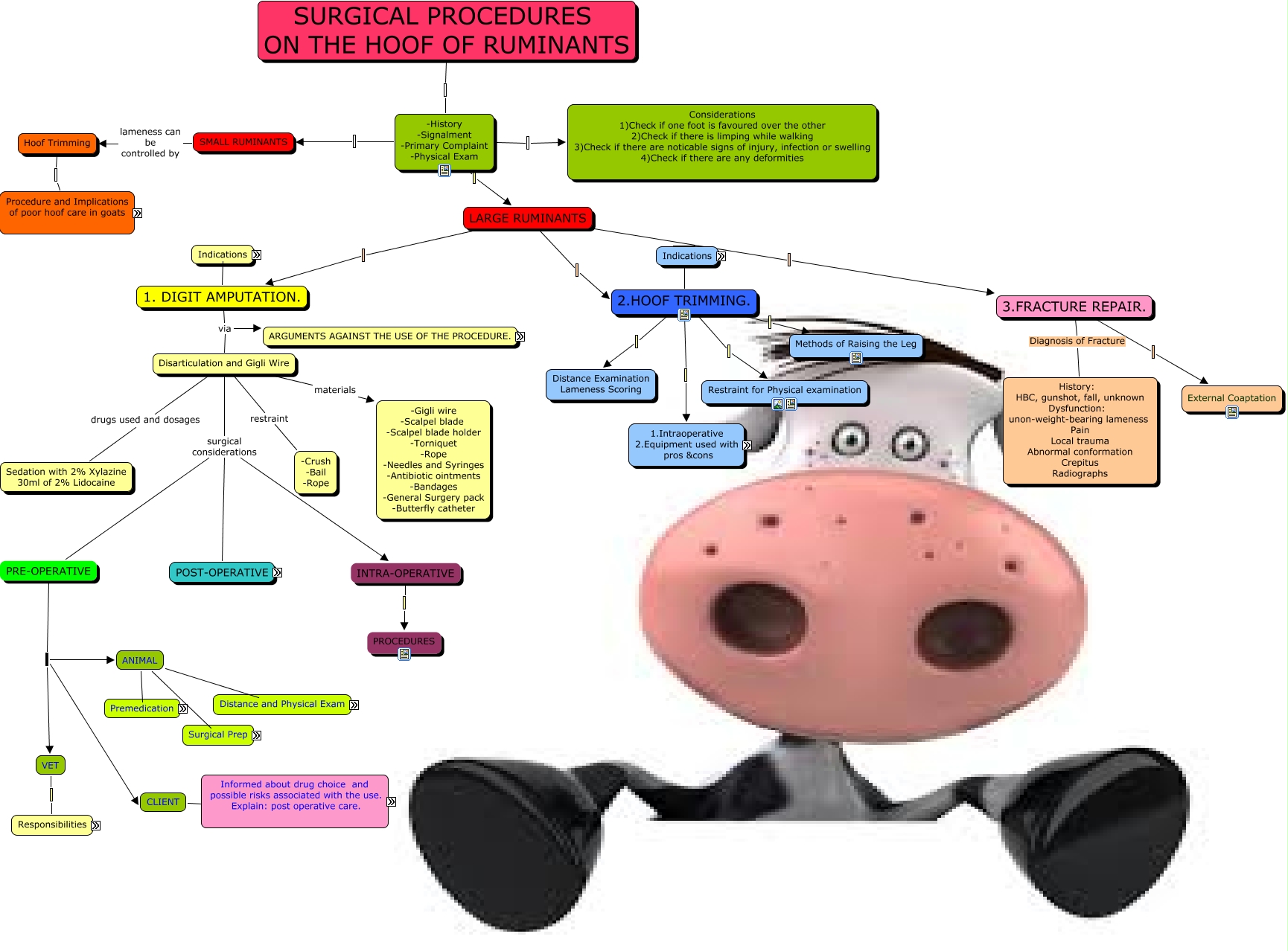 This Concept Map, created with IHMC CmapTools, has information related to: Hoof Trimming Cmap, implications of poor hoof care 1.Out-of-shape and overgrown hooves leads to hoof rot and hoof scald. 2.Sick goats cannot forage if they move constantly, and bad hooves take them down. 3.Severe hoof rot and scald can lead to death due to their fast metabolism. 4. Blood blisters can form between the toes which make walking very paiful and competing for food is difficult. 5. Goats dont live long when they are not eating., HOOF KNIFE TECHNIQUE 1. Confine animal. If two people are present,one person can lift the fron hoof while the othe person cleans and trims. Otherwise, one person can put the hoof betwwen their legs and have both hands free for trimming. 2. Clean the hoof using hoof pick. Clean between the toes and around the edges. Make sure to clean off as much from the bottom of the hoof as possible. You can scratch back and forth to work dow the base of the hoof. This will clean the hoof and also expose in detail the area you are working with. work out any crevices especially well 3. Once the foot is scraped clean, you will notice a ridge around the edge of the hoof. Run your finger across the hoof and you will notice around the edge it is longer. This is an initial boundary for cutting. The heel area is a softer pad and we do not that area at all. We limit trimming to the areas that the line shows up(outer edges and halfway up the inner toe). 4. Using a pair of nippers,trim around the bottom of the hoof, going up about halfway on the edges of either hoof and down to the toe. only nip off little at a time about 1cm at the front tip and 1/2 cm around the edges. Slowly keep nipping to shape the hoof. If at anytime you cut and reach blood: STOP! and do not trim any further. Try to even off the edges around the area without cutting any deeper. tools required photos, Disarticulation and Gigli Wire surgical considerations POST-OPERATIVE, LARGE RUMINANTS 1. DIGIT AMPUTATION., 1. DIGIT AMPUTATION. Indications for amputation -severe foot rot unresponsive to antibiotics and complicated by osteomyelitis -abscess formation with osteoarthritis of distal interphalangeal joint -tenosynovitis -infectious arthritis -severe phalangeal fractures -dislocation of phalangeal joints, 3.FRACTURE REPAIR. Diagnosis of Fracture History: HBC, gunshot, fall, unknown Dysfunction: unon-weight-bearing lameness Pain Local trauma Abnormal conformation Crepitus Radiographs, ANIMAL Distance and Physical Exam Visual Appearance of the Standing Animal, ANIMAL Distance and Physical Exam Characteristics of Lameness, 1. DIGIT AMPUTATION. via ARGUMENTS AGAINST THE USE OF THE PROCEDURE., 1. DIGIT AMPUTATION. via Disarticulation and Gigli Wire, 1. Immediate postoperative bleeding beneath the wound ???? May develop very slowly as gradual oozing or may occur as sudden massive hemorrhage. If the amount of blood loss is minimal it is aspirated and a pressure bandage is applied. A large amount of hemorrhage indicates an openly bleeding vessel; in such a situation the operative wound should be opened, the vessel ligated, and the incision resutured. Accumulations of blood should be removed to prevent infection or excessive fibrous tissue production., CLIENT ???? Informed about drug choice and possible risks associated with the use. Explain: post operative care., PRE-OPERATIVE VET, Disarticulation and Gigli Wire surgical considerations INTRA-OPERATIVE, SURGICAL PROCEDURES ON THE HOOF OF RUMINANTS -History -Signalment -Primary Complaint -Physical Exam, Disarticulation and Gigli Wire restraint -Crush -Bail -Rope, 2.HOOF TRIMMING. Restraint for Physical examination, Disarticulation and Gigli Wire surgical considerations PRE-OPERATIVE, ANIMAL Premedication PRE-MED-IM Xylazine 2%@0.05mg/kg ANAESTHETIC-IV Lidocaine 2% Volume: 20ml Ring Block, 2.HOOF TRIMMING. Methods of Raising the Leg