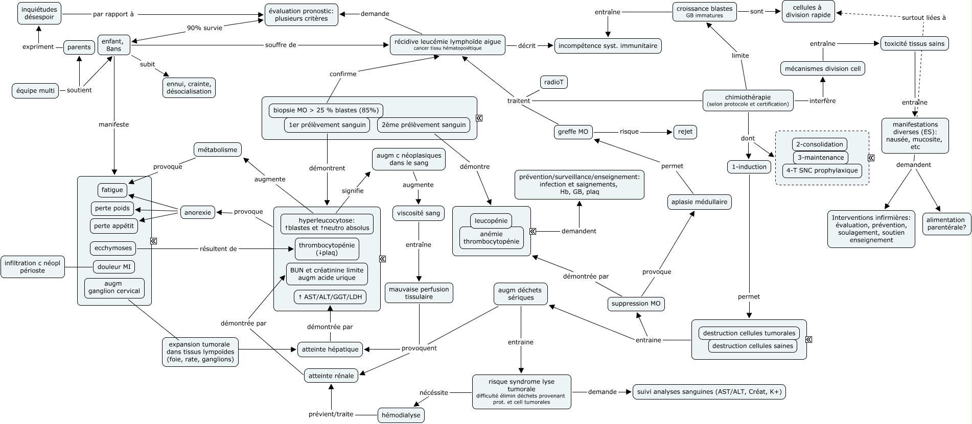 Cette carte de concepts créée avec IHMC CmapTools traite de: APSIC leucémie A13, chimiothérapie (selon protocole et certification) dont ????, viscosité sang entraîne mauvaise perfusion tissulaire, récidive leucémie lymphoïde aigue cancer tissu hématopoiétique demande évaluation pronostic: plusieurs critères, augm c néoplasiques dans le sang augmente viscosité sang, atteinte rénale démontrée par BUN et créatinine limite augm acide urique, enfant, 8ans subit ennui, crainte, désocialisation, risque syndrome lyse tumorale difficulté élimin déchets provenant prot. et cell tumorales demande suivi analyses sanguines (AST/ALT, Créat, K+), greffe MO risque rejet, toxicité tissus sains entraîne manifestations diverses (ES): nausée, mucosite, etc, ???? entraine suppression MO, équipe multi soutient parents, croissance blastes GB immatures sont cellules à division rapide, 1-induction permet ????, ???? demandent prévention/surveillance/enseignement: infection et saignements, Hb, GB, plaq, anorexie ???? fatigue, augm déchets sériques provoquent atteinte hépatique, chimiothérapie (selon protocole et certification) traitent récidive leucémie lymphoïde aigue cancer tissu hématopoiétique, hyperleucocytose: ↑blastes et ↑neutro absolus augmente métabolisme, risque syndrome lyse tumorale difficulté élimin déchets provenant prot. et cell tumorales nécéssite hémodialyse, ecchymoses résultent de thrombocytopénie (↓plaq)