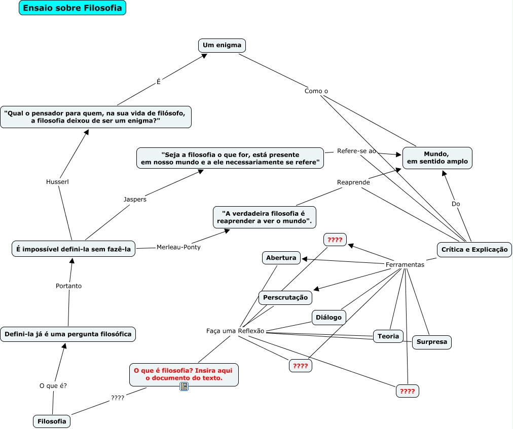 Esse mapa conceitual, produzido no IHMC CmapTools, tem a informação relacionada a: Teste filosofia, Teoria Faça uma Reflexão O que é filosofia? Insira aqui o documento do texto., Diálogo Faça uma Reflexão O que é filosofia? Insira aqui o documento do texto., O que é filosofia? Insira aqui o documento do texto. ???? Filosofia, ???? Faça uma Reflexão O que é filosofia? Insira aqui o documento do texto., "Seja a filosofia o que for, está presente em nosso mundo e a ele necessariamente se refere" Refere-se ao Crítica e Explicação, Crítica e Explicação Ferramentas Teoria, "Seja a filosofia o que for, está presente em nosso mundo e a ele necessariamente se refere" Refere-se ao Mundo, em sentido amplo, Surpresa Faça uma Reflexão O que é filosofia? Insira aqui o documento do texto., "A verdadeira filosofia é reaprender a ver o mundo". Reaprende Mundo, em sentido amplo, Um enigma Como o Crítica e Explicação, Crítica e Explicação Ferramentas Surpresa, É impossível defini-la sem fazê-la Husserl "Qual o pensador para quem, na sua vida de filósofo, a filosofia deixou de ser um enigma?", Abertura Faça uma Reflexão O que é filosofia? Insira aqui o documento do texto., É impossível defini-la sem fazê-la Merleau-Ponty "A verdadeira filosofia é reaprender a ver o mundo"., Defini-la já é uma pergunta filosófica Portanto É impossível defini-la sem fazê-la, "A verdadeira filosofia é reaprender a ver o mundo". Reaprende Crítica e Explicação, Crítica e Explicação Ferramentas ????, ???? Faça uma Reflexão O que é filosofia? Insira aqui o documento do texto., Crítica e Explicação Ferramentas Abertura, É impossível defini-la sem fazê-la Jaspers "Seja a filosofia o que for, está presente em nosso mundo e a ele necessariamente se refere"