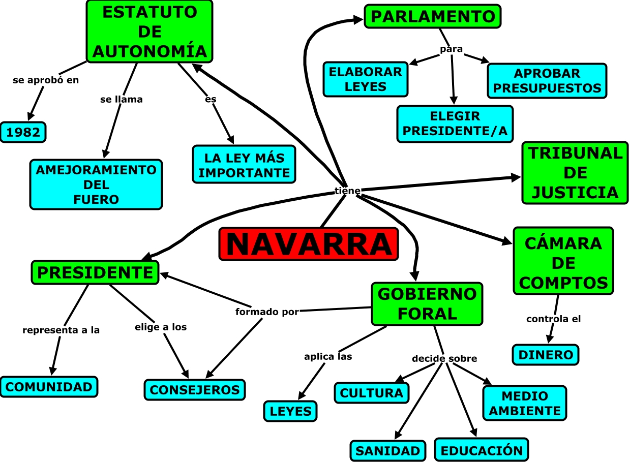 Este Cmap, tiene información relacionada con: navarra, CÁMARA DE COMPTOS controla el DINERO, PRESIDENTE representa a la COMUNIDAD, GOBIERNO FORAL aplica las LEYES, NAVARRA tiene GOBIERNO FORAL, PARLAMENTO para ELEGIR PRESIDENTE/A, NAVARRA tiene TRIBUNAL DE JUSTICIA, NAVARRA tiene PARLAMENTO, PRESIDENTE elige a los CONSEJEROS, NAVARRA tiene PRESIDENTE, GOBIERNO FORAL decide sobre CULTURA, ESTATUTO DE AUTONOMÍA se aprobó en 1982, PARLAMENTO para ELABORAR LEYES, GOBIERNO FORAL decide sobre EDUCACIÓN, GOBIERNO FORAL formado por PRESIDENTE, ESTATUTO DE AUTONOMÍA se llama AMEJORAMIENTO DEL FUERO, GOBIERNO FORAL formado por CONSEJEROS, ESTATUTO DE AUTONOMÍA es LA LEY MÁS IMPORTANTE, GOBIERNO FORAL decide sobre MEDIO AMBIENTE, GOBIERNO FORAL decide sobre SANIDAD, NAVARRA tiene CÁMARA DE COMPTOS