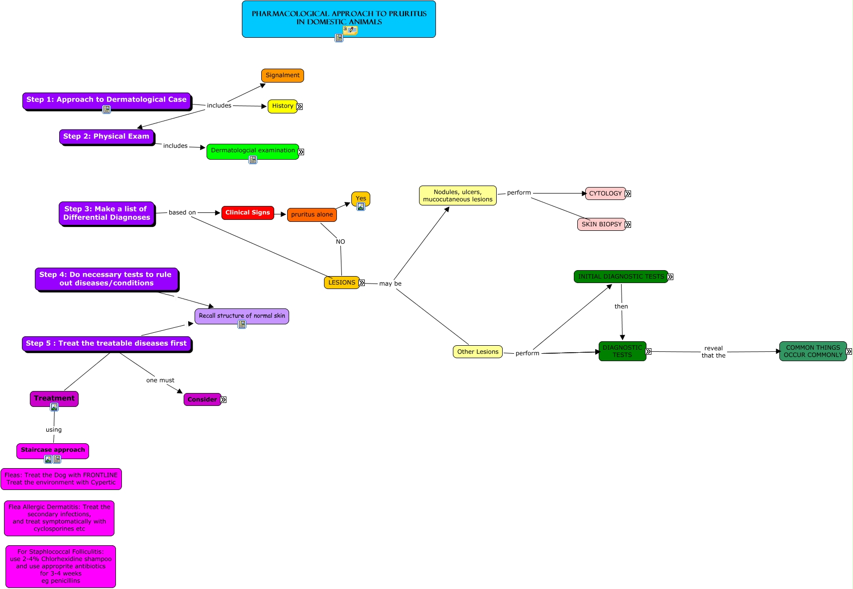 This Concept Map, created with IHMC CmapTools, has information related to: draft pruritus, Step 4: Do necessary tests to rule out diseases/conditions Recall structure of normal skin, 5. Skin assessment includes Evaluate areas of alopecia, Skin Scraping steps 1. Can use a spatula or scapel blade dulled scrape in the direction of hair growth and place material on a slide, Step 1: Approach to Dermatological Case includes Step 2: Physical Exam, implement strict flea control program. Afterwhich if pruritis continues.... ALLERGY TESTING, Dermatologic History include Seasonal influences, Step 2: Physical Exam includes Dermatologcial examination, organism(s) involved ... Malasezzia, 5. Skin assessment includes Check skin quality, Specific clinical signs and related behaviour: include Itching of head, lips, chin, periorbital area (rubbing, scratching), Skin Scraping steps Results, Skin Biopsy steps Results, Skin Biopsy steps 2.Use a biopsy punch size 4 to 6mm, Allergy such as Flea allergy, Step 3: Make a list of Differential Diagnoses based on lesions, Dermatologic History include Present of fleas and anti- parasitic treatments given., pruritus alone NO LESIONS, Cytology steps Results, INTITAL DIAGNOSTIC TESTS THAT CAN BE DONE include Coat brushings – Cheyletiella, lice, Dermatologic History include Owner's view on the dermatosis
