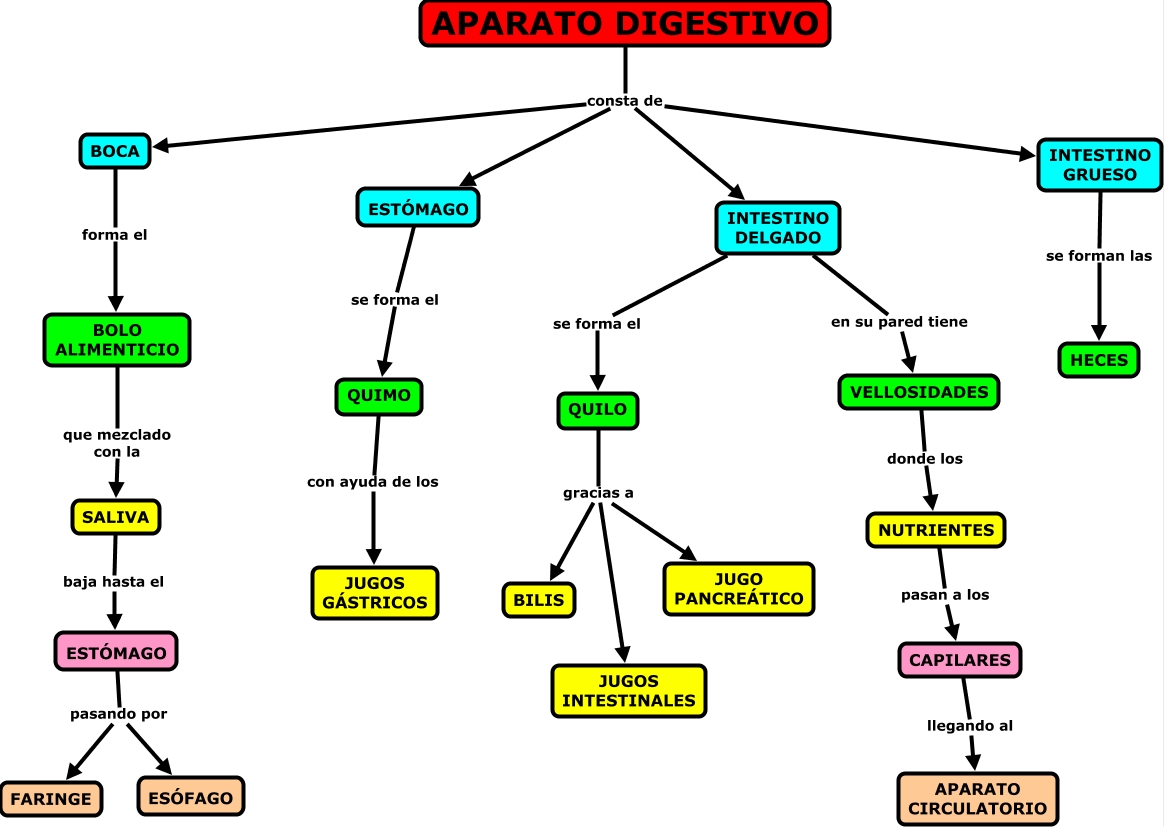 Este Cmap, tiene información relacionada con: PROCESO DIGESTIÓN, APARATO DIGESTIVO consta de INTESTINO GRUESO, CAPILARES llegando al APARATO CIRCULATORIO, VELLOSIDADES donde los NUTRIENTES, QUILO gracias a JUGO PANCREÁTICO, APARATO DIGESTIVO consta de BOCA, QUILO gracias a BILIS, INTESTINO GRUESO se forman las HECES, BOCA forma el BOLO ALIMENTICIO, SALIVA baja hasta el ESTÓMAGO, NUTRIENTES pasan a los CAPILARES, ESTÓMAGO pasando por FARINGE, ESTÓMAGO se forma el QUIMO, APARATO DIGESTIVO consta de INTESTINO DELGADO, QUIMO con ayuda de los JUGOS GÁSTRICOS, INTESTINO DELGADO se forma el QUILO, ESTÓMAGO pasando por ESÓFAGO, INTESTINO DELGADO en su pared tiene VELLOSIDADES, APARATO DIGESTIVO consta de ESTÓMAGO, QUILO gracias a JUGOS INTESTINALES, BOLO ALIMENTICIO que mezclado con la SALIVA