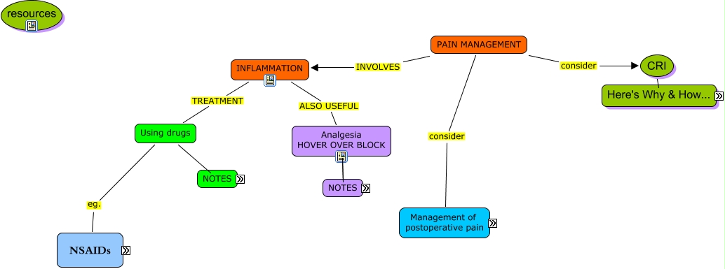 This Concept Map, created with IHMC CmapTools, has information related to: Pain Management and CRI, PAIN MANAGEMENT INVOLVES INFLAMMATION, NSAIDs Types of NSAIDs Salicylates - eg. Aspirin, Type of surgical procedure differs with After major surgery, Pre-emptive Pain Scoring System ???? Moderate Pain, Aspirin is an analgesic, fever reducer, anti-inflammatory, and a reducer of platelet aggregation Aspirin must be used with caution in cats because they can’t metabolize it as fast as other species If used on a cat, Aspirin is given in lower dosages less frequently conplications The use of Aspirin by animal owners may lead to a toxicity levels which rise over time Signs of salicylate toxicity include: Gastrointestinal problems Anorexia, abdominal pain, vomiting, diarrhea Respiratory problems Panting Neurological problems Restlessness, anxiety, seizures Bleeding problems Kidney failure, Steroids Example Glucocorticoid Use and effects, Management of postoperative pain includes general guildlines of surgery, Flunixin meglumine about Inhibits cyclooxygenase Used in cattle and horses (most common) for musculoskeletal and colic pain Is a potent analgesic, antipyretic, and anti-inflammatory Extereme caution in small animals, NSAIDs Types of NSAIDs Propionic acid derivatives, Using drugs concerning NSAID's, A mechanism-based approach involves Synergistic Decreased potential for adverse reactions Effective E.g NSAID - decrease transduction Local Block - stops transmission Opiod and Alpha 2 agonist- decrease modulation, Inhibit prostaglandin synthesis Phenylbutazone is an analgesic, antipyretic, and anti-inflammatory Used in equine medicine for musculoskeletal pain Phenylbutazone (“bute”) Frequently used in equine medicine for musculoskeletal pain. ad info Protein losing enteropathy has been seen in horses and ponies, Supportive therapy includes Soft bedding, Management of postoperative pain includes Avoid social isolation, Inhibit prostaglandin synthesis Phenylbutazone is an analgesic, antipyretic, and anti-inflammatory Used in equine medicine for musculoskeletal pain Phenylbutazone (“bute”) Frequently used in equine medicine for musculoskeletal pain. ad info Phenylbutazone has caused death by aplastic anaemia in man, and since safe milk and meat residue levels cannot be established, it is banned in food producing animals, Management of postoperative pain includes Preemptive analgesia, Supportive therapy includes Warm environment, NSAIDs side effects The side effects associated with the use of NSAIDs are related to their non-specific inhibition of COX enzymes. The constitutively expressed COX-1 has many functions within the normal body, and suppression of these may lead to adverse reactions., Inhibits cyclooxygenase Used in cattle and horses (most common) for musculoskeletal and colic pain Is a potent analgesic, antipyretic, and anti-inflammatory Extereme caution in small animals more info used for such conditions as pneumonia, mastitis and endotoxic shock, Deracoxib (Deramaxx) are indicated for the control of pain and inflammation associated with osteoarthritis and postoperative pain and inflammation due to orthopedic surgery and dental surgery in dogs. Do NOT use in cats. side effects The most common side effects of Deracoxib involve digestive issues such as vomiting and decrease appetite. Other possible side effects of Deracoxib include: Change in bowl movements (diarrhea, or black, tarry or bloody stools) Change in behavior (decreased or increased activity level, incoordination, seizure, or aggression) Jaundice (yellowing of gums, skin or whites of eyes) Increase water consumption or urination changes (frequency, color, or smell) Seizure Skin irritation (redness, scabs, or scratching) Stomach pain Stomach ulcers Unexpected weight loss
