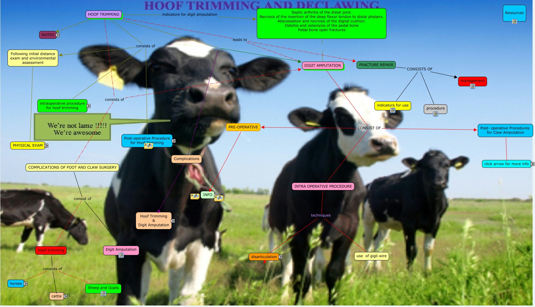 This Concept Map, created with IHMC CmapTools, has information related to: group1 hoof trimming and digit amputation final, Technique Veterinarian, bandage applied to control hemorrhage bandage should be removed, HOOF TRIMMING looking at METHODS, Animal ???? Owner, prevent the metabolic and microbial causes of lameness try practice good hygiene, PHYSICAL EXAM TPR and overall appearance, Veterinarian Animal, Horses consists of Thrush, Environment Technique, HOOF TRIMMING leads to DIGIT AMPUTATION, penicillin G, IM, for 3 days nonirritant bacteriostatic agent (such as nitrofurazone or a sulfa preparation) should be applied as a topical dressing, Post- operative for hoof trimming footrot ways to treat other foot problems, PRE-OPERATIVE Consists General physical exam, Cows that have a history of problems consider need re-balancing every two months, Precautions consider Owner, Technique Environment, Hoof trimming After, All cows need a maintenance trim twice a year consider once during the early dry period and again midway through the lactation, HOOF TRIMMING looking at TOOLS, Digit Amputation ???? Before