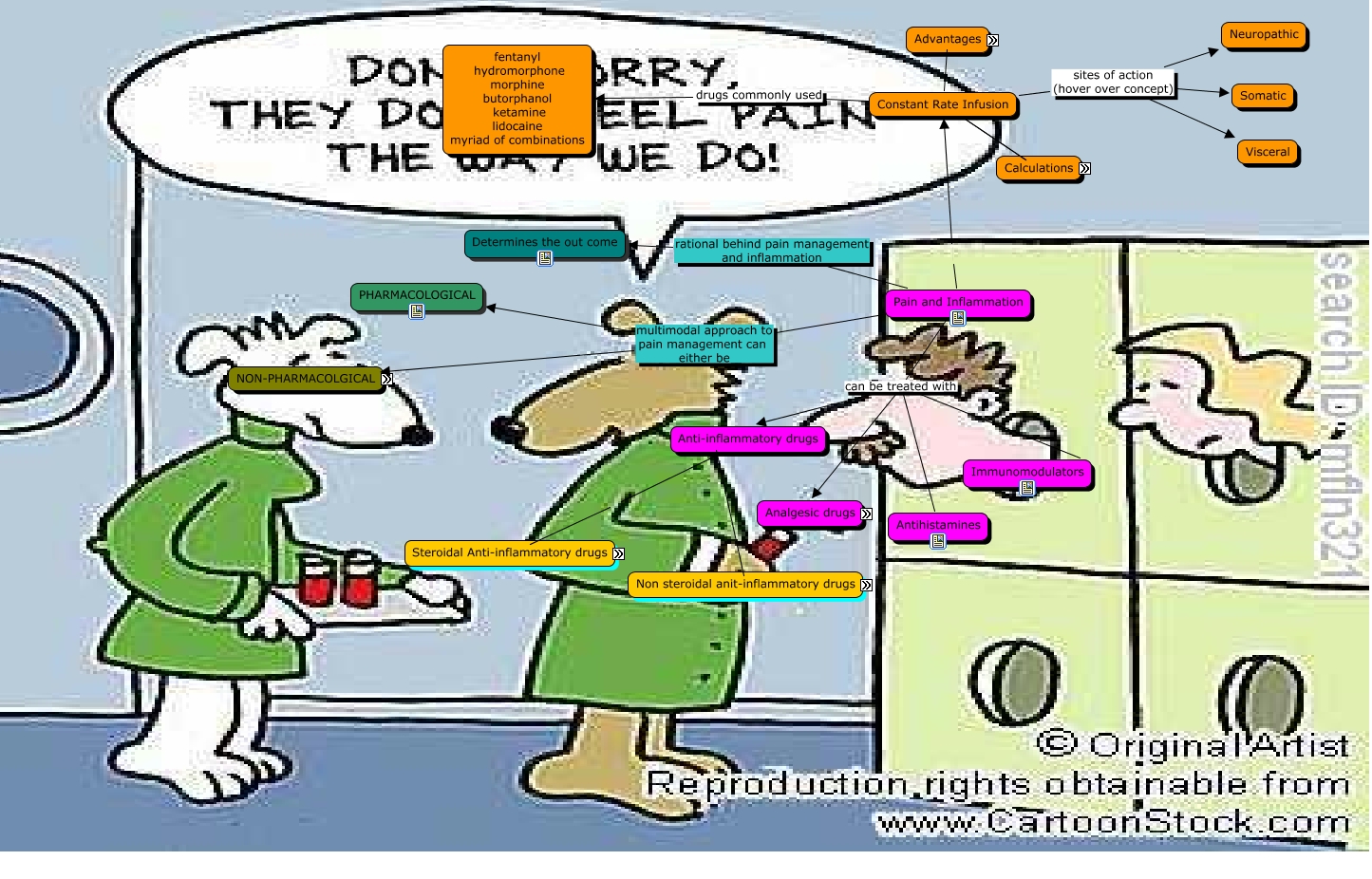 This Concept Map, created with IHMC CmapTools, has information related to: Analgesia, Pain and Inflammation Constant Rate Infusion, Pain and Inflammation can be treated with Anti-inflammatory drugs, Analgesic drugs Others- Gabapentin & TCA's, Pain and Inflammation can be treated with Immunomodulators, Non- steroidal anti-inflammatory drugs Miscellaneous NSAIDS, NON-PHARMACOLOGICAL 1. Controlled exercise and weight managemnet used to decreasejoint stress and improve muscular support of the joints. 2. simple environmental coditions such as softt bedding, nonslip floors, etc. can prevent or reduce discomfort. 3.Quality in hospitals which include use of soft padded bedding during illnes or surgery to enhance, warm wateror air blankets to decrease pain and facilitate recovery from anaesthesia. 4.Nutraceuticals(nutrition) such as glucosamine and chondroitin, may decrease joint inflammation and assist in cartilage repair. omega-3- fatty acids decrease inflammation in cartilage of dogs with osteoarthritis, and dietary intervention can improve clinical signs in osteoarthritc dogs. 5.Rehabilitation therapy may be used to return a patient to normal function following surgery or trauma or as part of a long-term strategy to manage pain., Analgesic drugs Opioids, Analgesic drugs NMDA antagonists, Steroidal anti-inflammatory drugs Intermediate acting 1) Isoflupredone 2) Methylprednisolone 3) Methylprednisolone acetate 4) Prednisone/Prednisolone 5) Prednisolone sodium succucinate 6) Triamcinlone, Steroidal anti-inflammatory drugs Short acting 1) Cortisone 2)Hydrocortisone, Constant Rate Infusion sites of action (hover over concept) Neuropathic, Non- steroidal anti-inflammatory drugs COX-2 Inhibitors, Constant Rate Infusion drugs commonly used fentanyl hydromorphone morphine butorphanol ketamine lidocaine myriad of combinations, Non- steroidal anti-inflammatory drugs Tepoxalin, Steroidal anti-inflammatory drugs Long acting 1) Betamethasone 2)Dexamethasone 3) Flumethasone 4)Fluocinolone, Pain and Inflammation rational behind pain management and inflammation Determines the out come, Non- steroidal anti-inflammatory drugs Fenamates, Pain and Inflammation can be treated with Antihistamines, Non- steroidal anti-inflammatory drugs Pyrazolone Derivatives, Analgesic drugs NSAIDS