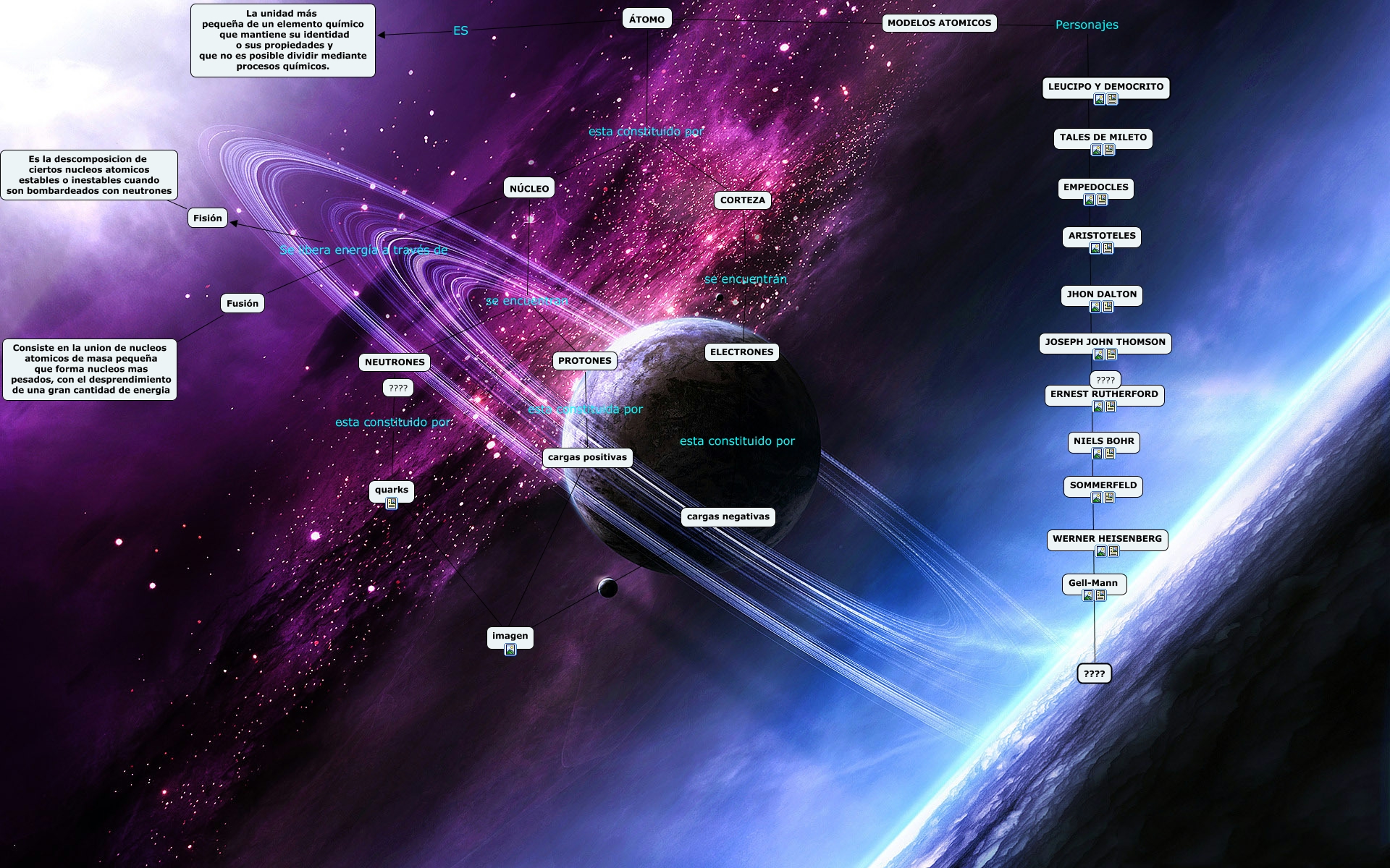 Este Cmap, tiene información relacionada con: CUBANOS, ÁTOMO ???? MODELOS ATOMICOS, NÚCLEO se encuentran NEUTRONES, ÁTOMO esta constituido por CORTEZA, NÚCLEO Se libera energía a través de Fusión, cargas negativas ???? imagen, MODELOS ATOMICOS Personajes ????, Fusión ???? Consiste en la union de nucleos atomicos de masa pequeña que forma nucleos mas pesados, con el desprendimiento de una gran cantidad de energia, cargas positivas ???? imagen, quarks ???? imagen, NEUTRONES esta constituido por quarks, ÁTOMO ES La unidad más pequeña de un elemento químico que mantiene su identidad o sus propiedades y que no es posible dividir mediante procesos químicos., Fisión ???? Es la descomposicion de ciertos nucleos atomicos estables o inestables cuando son bombardeados con neutrones, ÁTOMO esta constituido por NÚCLEO, NÚCLEO Se libera energía a través de Fisión, PROTONES esta constituida por cargas positivas, ELECTRONES esta constituido por cargas negativas, NÚCLEO se encuentran PROTONES, CORTEZA se encuentran ELECTRONES