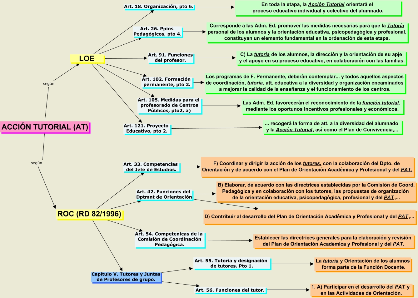 Este Cmap, tiene información relacionada con: ACCION TUTORIAL_Itziar_Calvo, ROC (RD 82/1996) Capítulo V. Tutores y Juntas de Profesores de grupo. Art. 56. Funciones del tutor., ACCIÓN TUTORIAL (AT) según LOE, Art. 55. Tutoría y designación de tutores. Pto 1. ???? La tutoría y Orientación de los alumnos forma parte de la Función Docente., LOE Art. 102. Formación permanente, pto 2. Los programas de F. Permanente, deberán contemplar... y todos aquellos aspectos de coordinación, tutoría, att. educativa a la diversidad y organización encaminados a mejorar la calidad de la enseñanza y el funcionamiento de los centros., LOE Art. 105. Medidas para el profesorado de Centros Públicos, pto2, a) Las Adm. Ed. favorecerán el reconocimiento de la función tutorial, mediante los oportunos incentivos profesionales y económicos., ROC (RD 82/1996) Art. 33. Competencias del Jefe de Estudios. F) Coordinar y dirigir la acción de los tutores, con la colaboración del Dpto. de Orientación y de acuerdo con el Plan de Orientación Académica y Profesional y del PAT., ROC (RD 82/1996) Capítulo V. Tutores y Juntas de Profesores de grupo. Art. 55. Tutoría y designación de tutores. Pto 1., ROC (RD 82/1996) Art. 42. Funciones del Dptmnt de Orientación B) Elaborar, de acuerdo con las directrices establecidas por la Comisión de Coord. Pedagógica y en colaboración con los tutores, las propuestas de organización de la orientación educativa, psicopedagógica, profesional y del PAT,..., LOE Art. 18. Organización, pto 6. En toda la etapa, la Acción Tutorial orientará el proceso educativo individual y colectivo del alumnado., ROC (RD 82/1996) Art. 42. Funciones del Dptmnt de Orientación D) Contribuir al desarrollo del Plan de Orientación Académica y Profesional y del PAT,..., LOE Art. 121. Proyecto Educativo, pto 2. ... recogerá la forma de att. a la diversidad del alumnado y la Acción Tutorial, así como el Plan de Convivencia,..., ACCIÓN TUTORIAL (AT) según ROC (RD 82/1996), LOE Art. 26. Ppios Pedagógicos, pto 4. Corresponde a las Adm. Ed. promover las medidas necesarias para que la Tutoría personal de los alumnos y la orientación educativa, psicopedagógica y profesional, constituyan un elemento fundamental en la ordenación de esta etapa., LOE Art. 91. Funciones del profesor. C) La tutoría de los alumnos, la dirección y la orientación de su apje y el apoyo en su proceso educativo, en colaboración con las familias., ROC (RD 82/1996) Art. 54. Competenicas de la Comisión de Coordinación Pedagógica. Establecer las directrices generales para la elaboración y revisión del Plan de Orientación Académica y Profesional y del PAT., Art. 56. Funciones del tutor. ???? 1. A) Participar en el desarrollo del PAT y en las Actividades de Orientación.