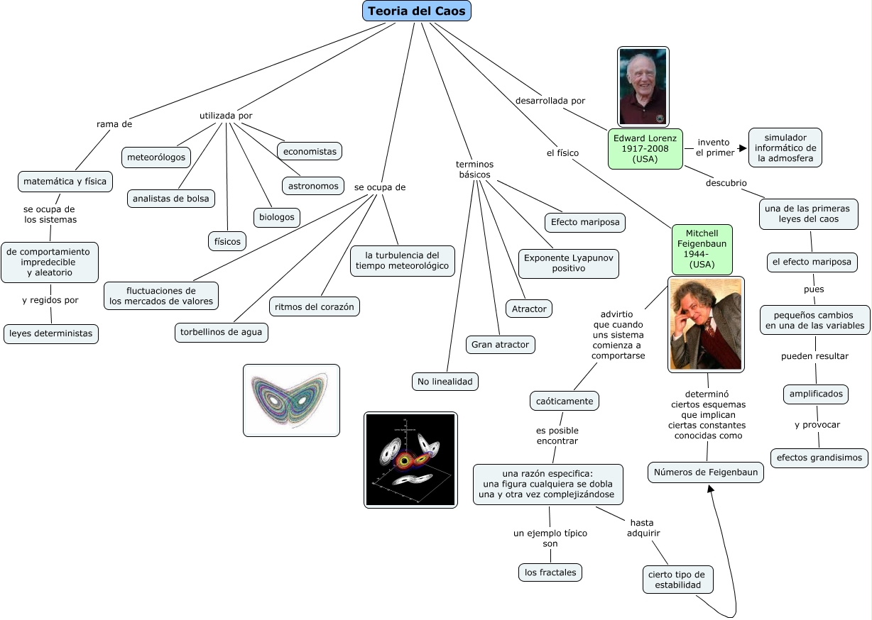 Este Cmap, tiene información relacionada con: Teoría del caos, una de las primeras leyes del caos el efecto mariposa, Teoria del Caos utilizada por astronomos, Teoria del Caos se ocupa de la turbulencia del tiempo meteorológico, una razón especifica: una figura cualquiera se dobla una y otra vez complejizándose hasta adquirir cierto tipo de estabilidad, de comportamiento impredecible y aleatorio y regidos por leyes deterministas, caóticamente es posible encontrar una razón especifica: una figura cualquiera se dobla una y otra vez complejizándose, Teoria del Caos utilizada por economistas, Teoria del Caos utilizada por meteorólogos, Teoria del Caos el físico Mitchell Feigenbaun 1944- (USA), Teoria del Caos terminos básicos Atractor, matemática y física se ocupa de los sistemas de comportamiento impredecible y aleatorio, Teoria del Caos utilizada por biologos, Teoria del Caos se ocupa de torbellinos de agua, Teoria del Caos utilizada por físicos, Teoria del Caos terminos básicos No linealidad, Mitchell Feigenbaun 1944- (USA) determinó ciertos esquemas que implican ciertas constantes conocidas como Números de Feigenbaun, Mitchell Feigenbaun 1944- (USA) advirtio que cuando uns sistema comienza a comportarse caóticamente, el efecto mariposa pues pequeños cambios en una de las variables, Teoria del Caos se ocupa de ritmos del corazón, Teoria del Caos utilizada por analistas de bolsa