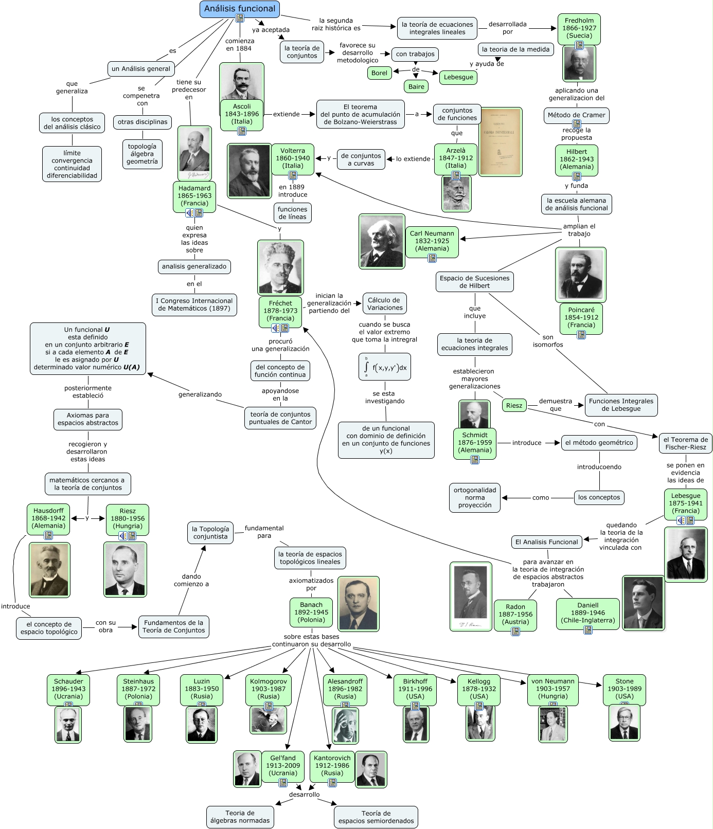 Este Cmap, tiene información relacionada con: 1 Análisis funcional, Espacio de Sucesiones de Hilbert que incluye la teoria de ecuaciones integrales, Análisis funcional ya aceptada la teoría de conjuntos, El teorema del punto de acumulación de Bolzano-Weierstrass a conjuntos de funciones, Fredholm 1866-1927 (Suecia) aplicando una generalizacion del Método de Cramer, Lebesgue y ayuda de la teoria de la medida, teoría de conjuntos puntuales de Cantor generalizando Un funcional U esta definido en un conjunto arbitrario E si a cada elemento A de E le es asignado por U determinado valor numérico U(A), con trabajos de Baire, la teoria de ecuaciones integrales establecieron mayores generalizaciones Schmidt 1876-1959 (Alemania), Fundamentos de la Teoría de Conjuntos dando comienzo a la Topología conjuntista, Un funcional U esta definido en un conjunto arbitrario E si a cada elemento A de E le es asignado por U determinado valor numérico U(A) posteriormente estableció Axiomas para espacios abstractos, Análisis funcional comienza en 1884 Ascoli 1843-1896 (Italia), del concepto de función continua apoyandose en la teoría de conjuntos puntuales de Cantor, Kantorovich 1912-1986 (Rusia) desarrollo Teoria de álgebras normadas, Arzelà 1847-1912 (Italia) lo extiende de conjuntos a curvas, Banach 1892-1945 (Polonia) sobre estas bases continuaron su desarrollo Birkhoff 1911-1996 (USA), la escuela alemana de análisis funcional amplian el trabajo Volterra 1860-1940 (Italia), Cálculo de Variaciones cuando se busca el valor extremo que toma la intregral <math xmlns="http://www.w3.org/1998/Math/MathML"> <munderover> <int/> <mtext> a </mtext> <mtext> b </mtext> </munderover> <mtext> f </mtext> <mfenced open="(" close=")"> <mtext> x,y,y' </mtext> </mfenced> <mtext> dx </mtext> </math>, Banach 1892-1945 (Polonia) sobre estas bases continuaron su desarrollo Luzin 1883-1950 (Rusia), la teoria de ecuaciones integrales establecieron mayores generalizaciones Riesz, Schmidt 1876-1959 (Alemania) introduce el método geométrico